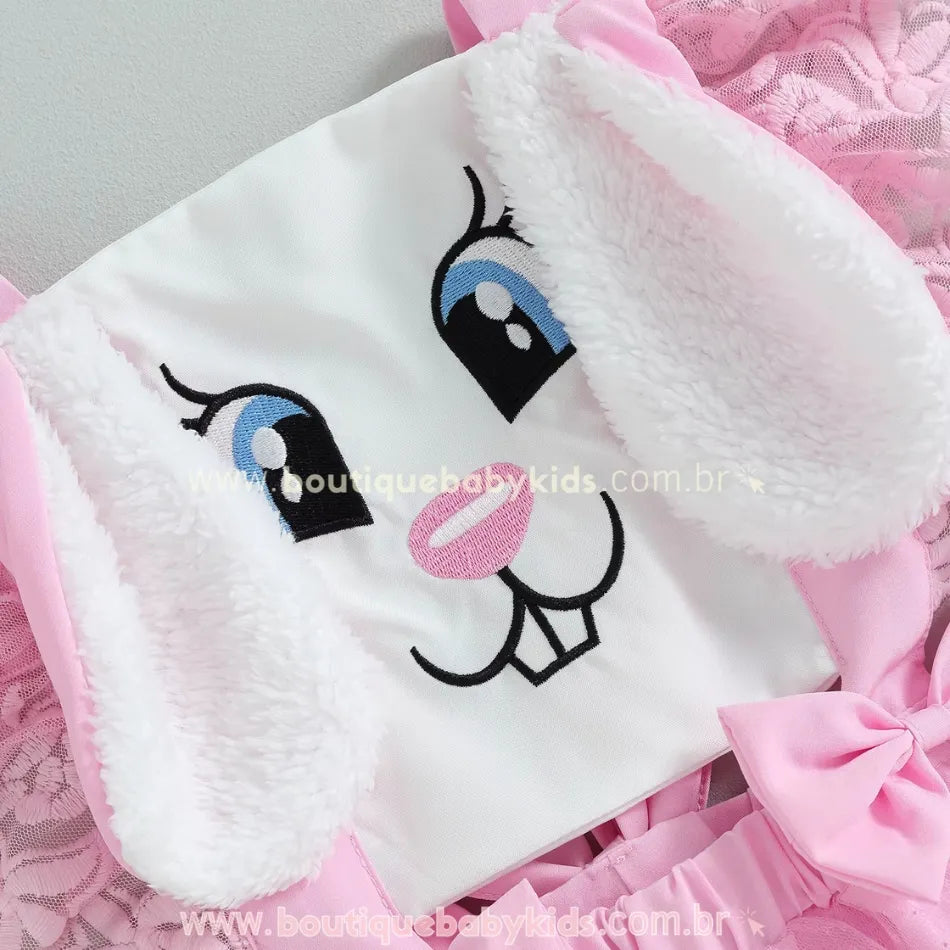 Design Encantador: O romper conta com uma estampa bordada no peitoral, representando o rosto de uma coelhinha sorridente, com olhinhos expressivos, narizinho delicado e bochechas rosadas. Além disso, as orelhinhas felpudas aplicadas no topo criam um efeito tridimensional adorável.