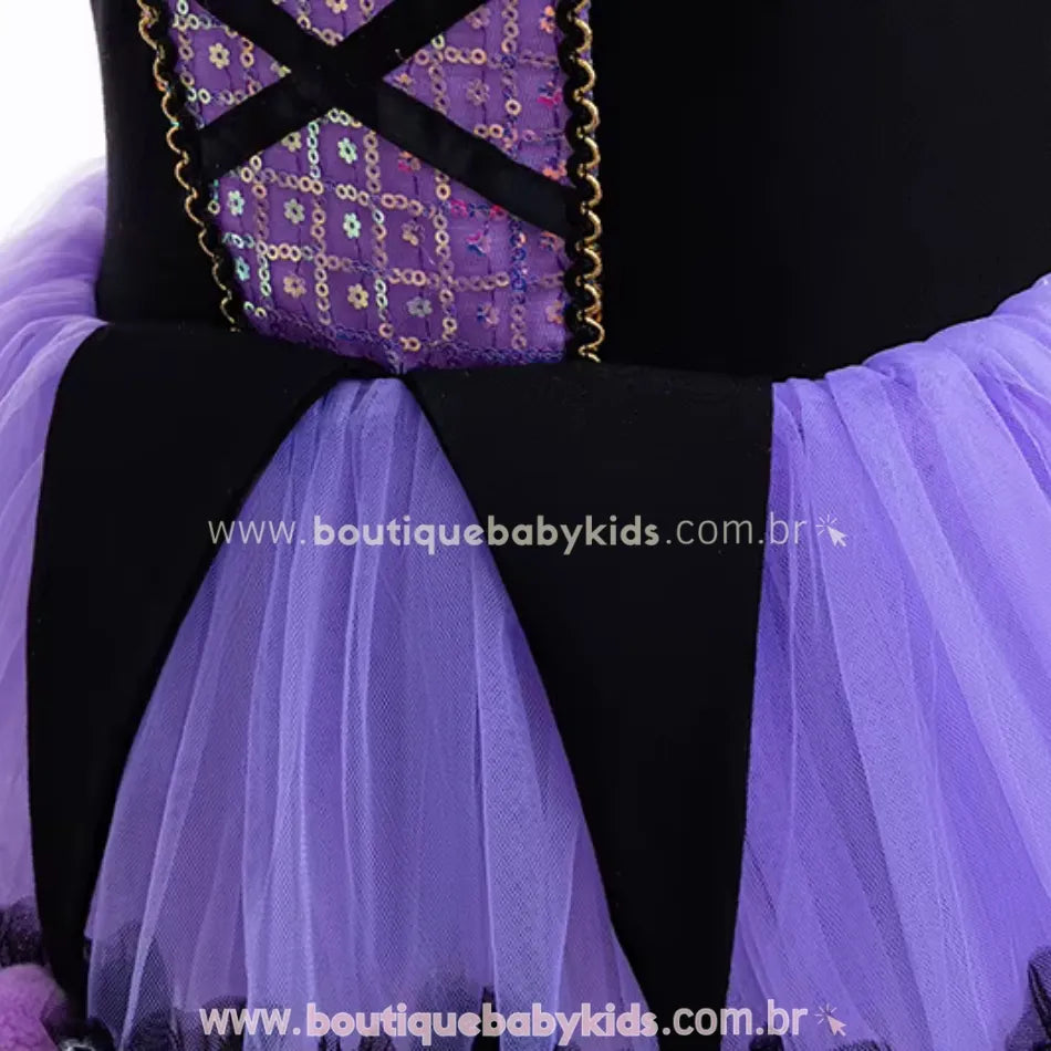Vestido infantil temático de bruxinha na cor preta e roxa, com mangas bufantes de tule, corpete com detalhe de espartilho e saia volumosa de tule com babadinhos pretos e pompons roxos.