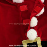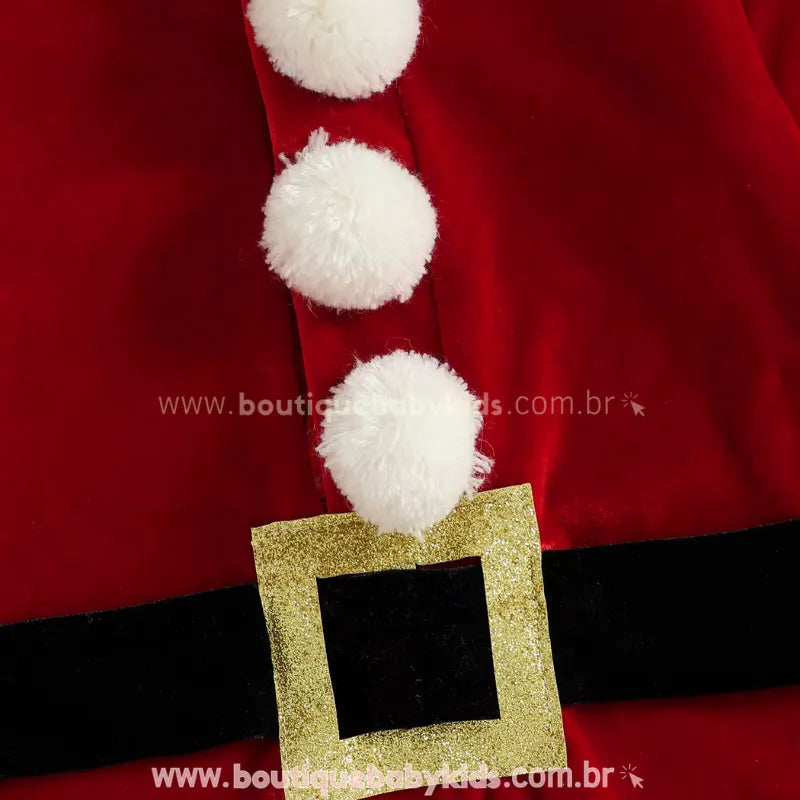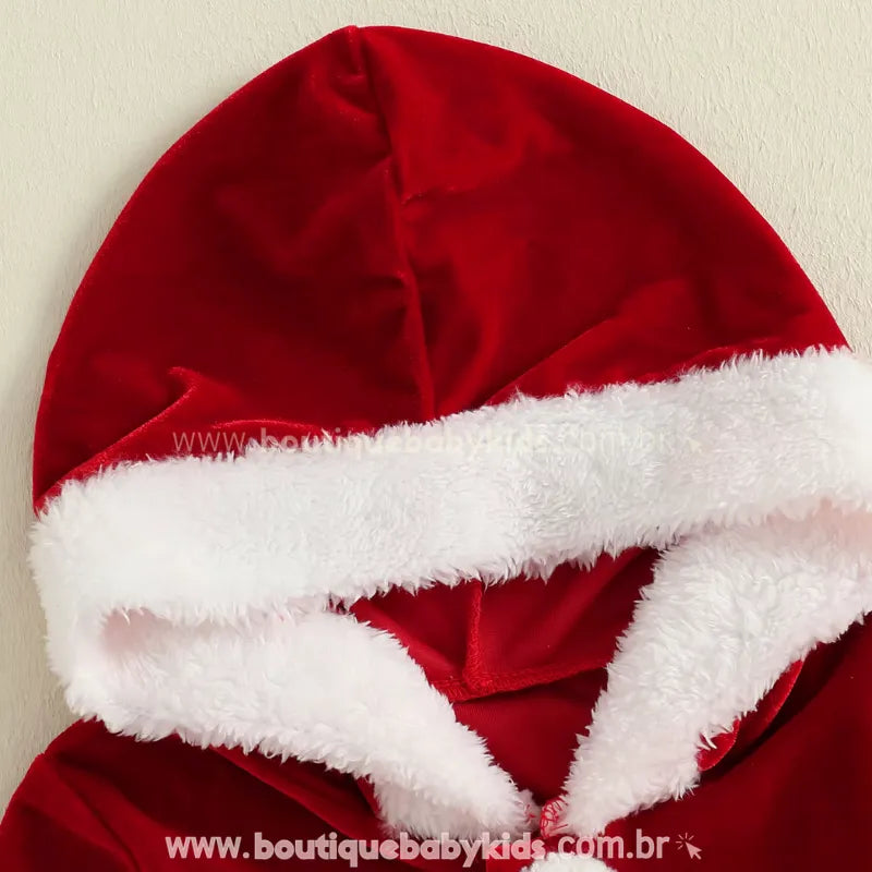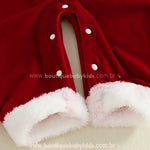 Design Temático de Natal: Inspirado no visual clássico do Papai Noel, o macacão conta com pelúcia fofinha na gola e nos punhos, botões decorativos em forma de pompons e cinto em faixa com fivela decorativa dourada. Um look completo e super festivo para o Natal.