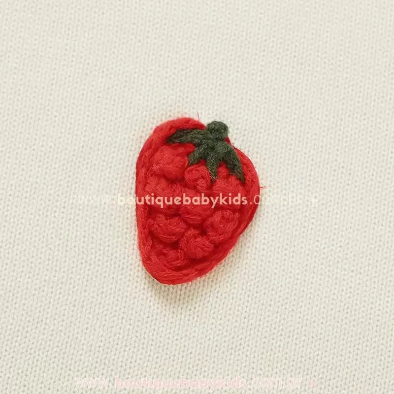 Aplicações de Moranguinhos: Pequenos morangos em tricot são cuidadosamente aplicados na superfície da manta, trazendo um toque artesanal, lúdico e encantador.