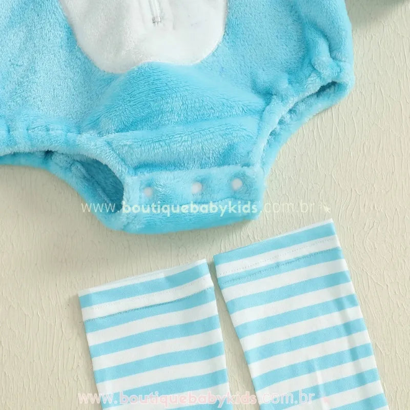 Meias Combinando: Acompanha meia listrada azul e branca, combinando com o body e deixando o look ainda mais divertido.
