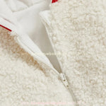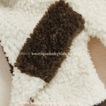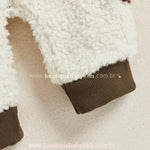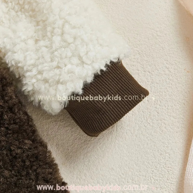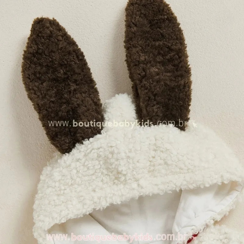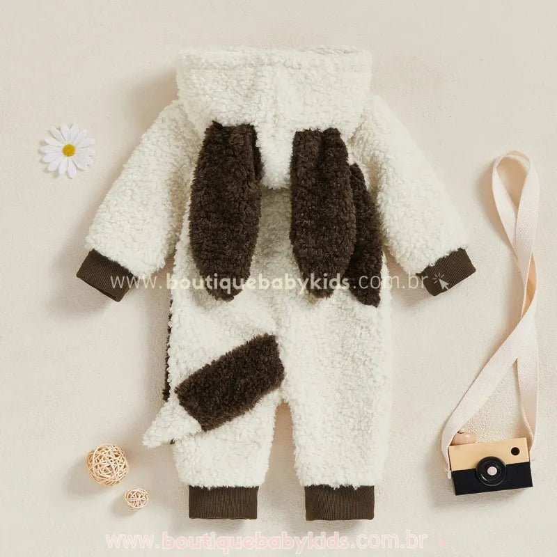 Design Temático de Cachorrinho: Capuz com orelhas marrons peludinhas, manchinhas aplicadas nas pernas e costas, e detalhes que remetem a um cachorrinho fofo.
