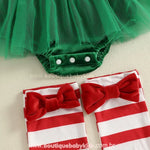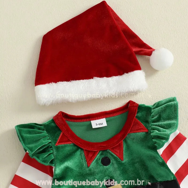 Conjunto Completo: Acompanha gorro vermelho com pompom e meias listradas com laços, garantindo um look completo e irresistível para o seu pequeno elfo natalino.