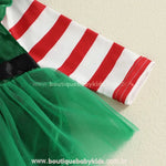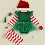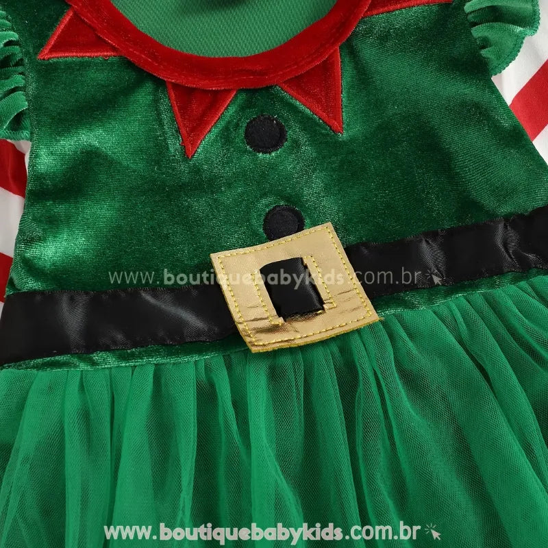 Design Encantador de Elfo: O body verde com gola vermelha, cinto decorativo e saia de tule traz o toque natalino perfeito, enquanto as mangas listradas completam o visual alegre e festivo.