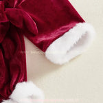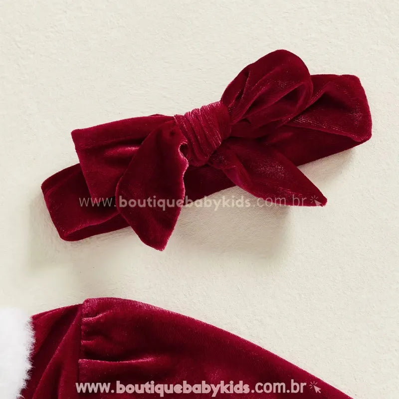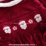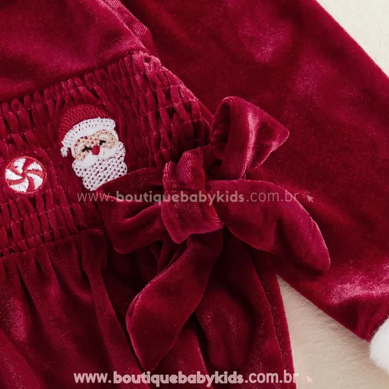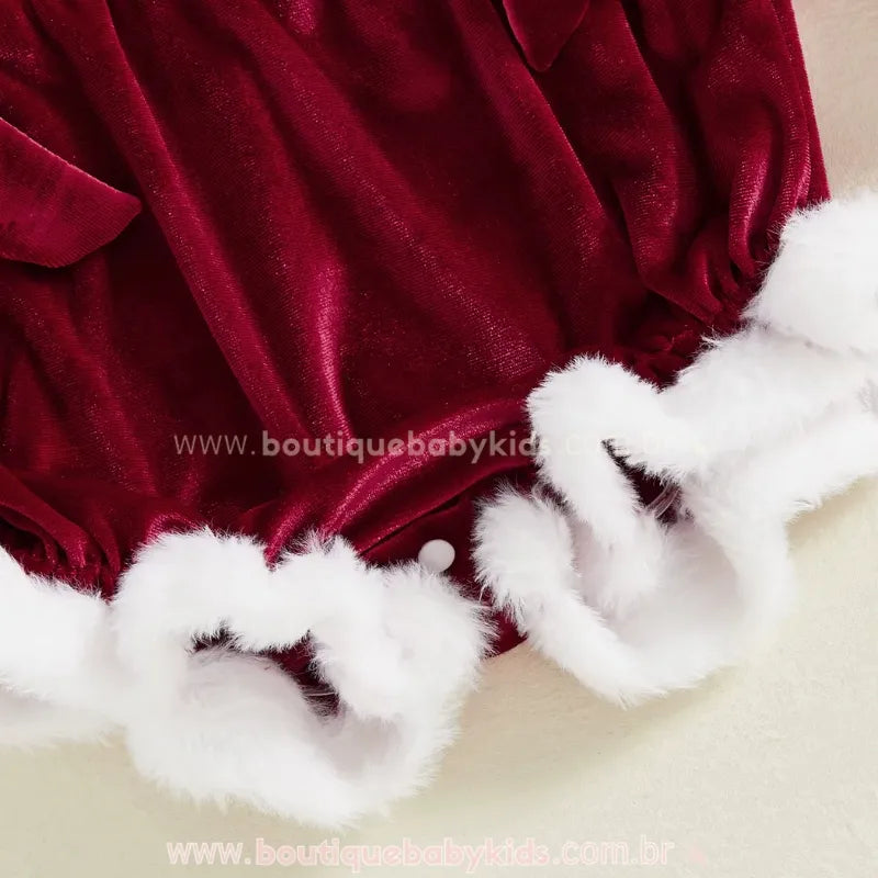 Design Encantador: Em um tom clássico de vermelho, o body traz bordados detalhados do Papai Noel e docinhos, além de laços laterais e acabamento em pelúcia branca nas mangas e na barra, criando um visual elegante e festivo.