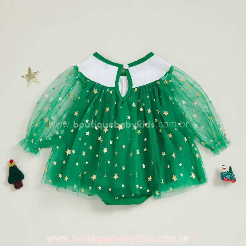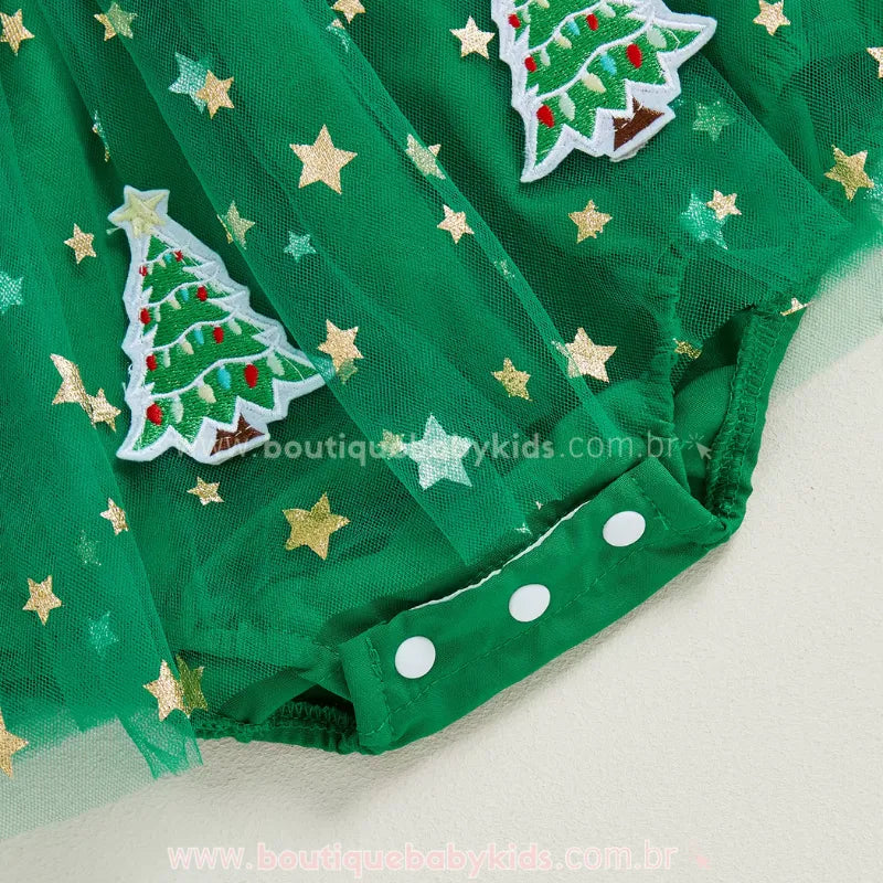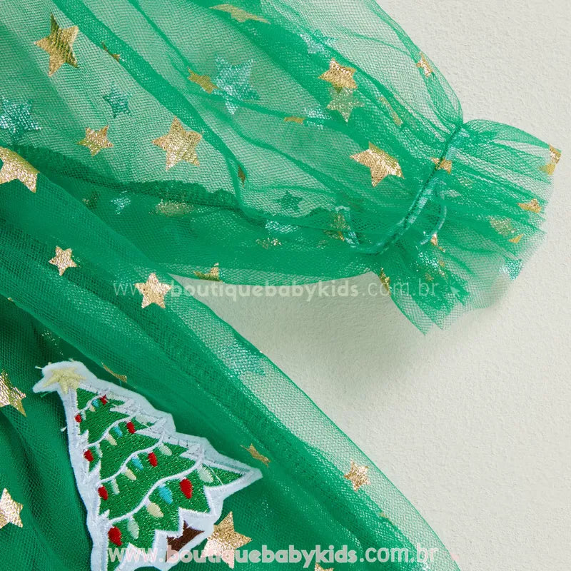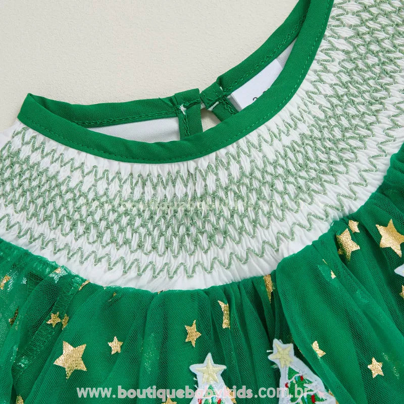 Design Encantador: Com pequenas árvores de Natal aplicadas e estrelas douradas decorando o tule, a peça ganha um charme festivo irresistível. O detalhe smocked no decote deixa tudo ainda mais delicado e elegante.