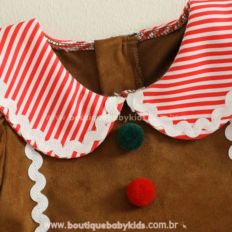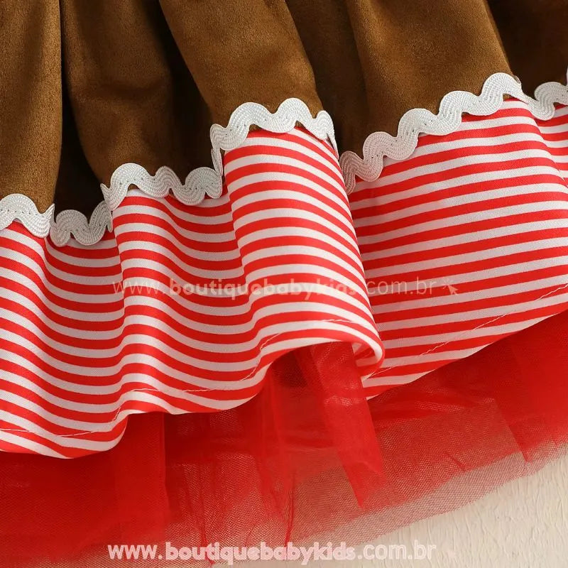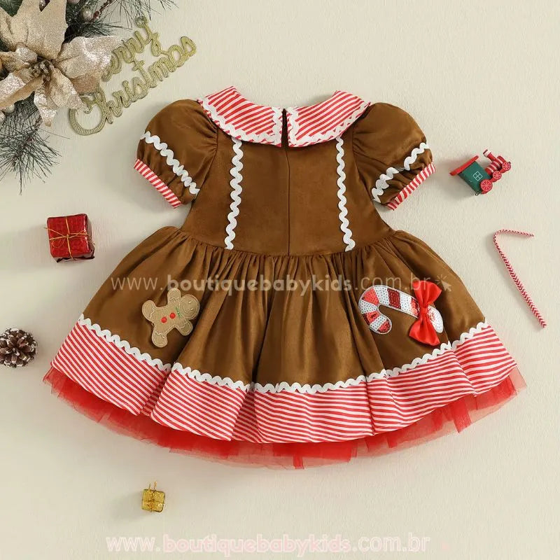 Inspirado nos Doces de Natal: O vestido conta com gola e mangas bufantes, detalhes em fita ondulada branca e aplicações de biscoitinho e bengala natalina que deixam o visual encantador.