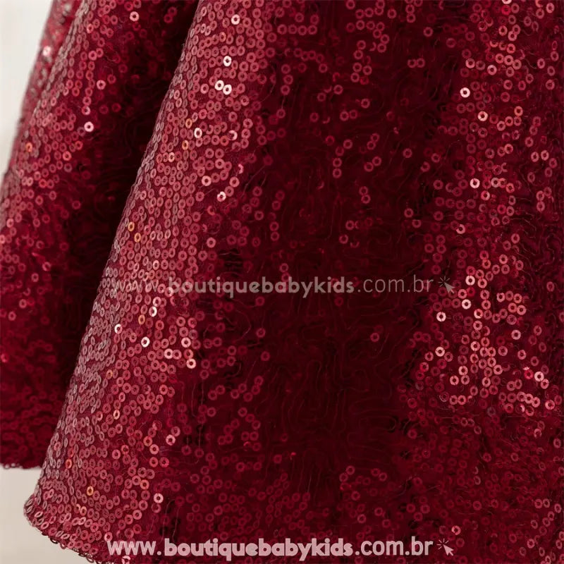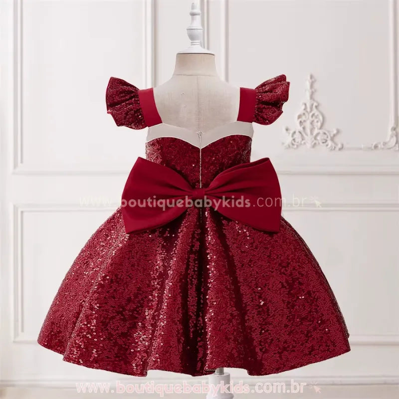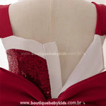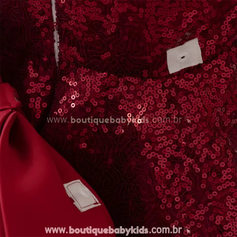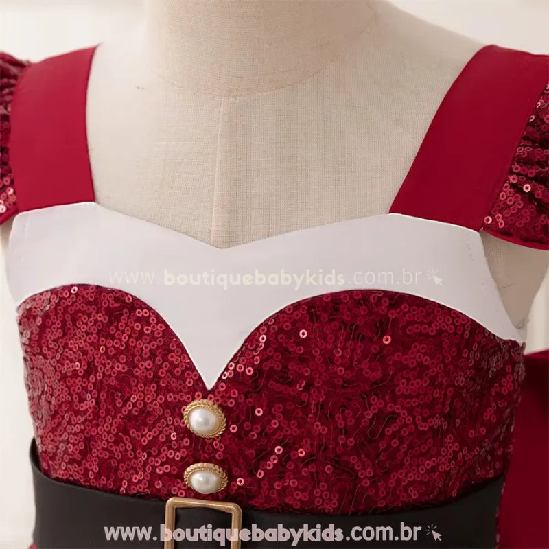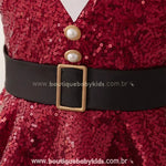 Design Encantador e Festivo: Com modelagem princesa e saia rodada, o vestido traz todo o charme do Natal em um tom vermelho vibrante. O busto com brilho intenso, o cinto com fivela dourada e o laço volumoso nas costas completam o visual com um toque especial de elegância e doçura.