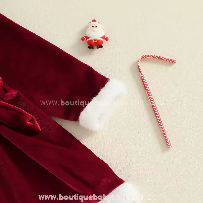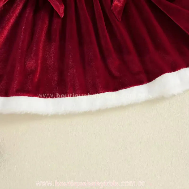 Design Clássico e Encantador: No tom vermelho natalino, o vestido traz bordados delicados do Papai Noel e docinhos na pala, laços aplicados na cintura e acabamentos em pelúcia branca nas mangas e barra. Um visual cheio de charme e espírito natalino!
