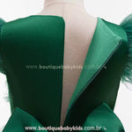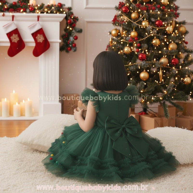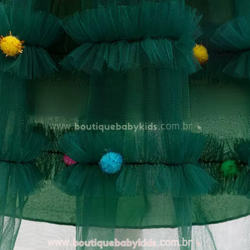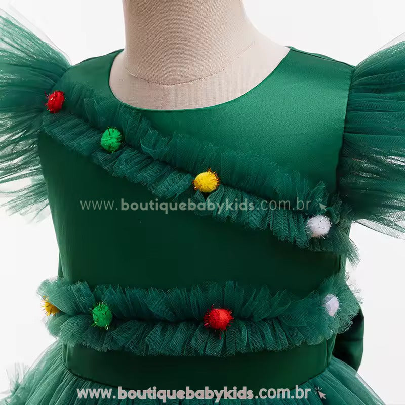 Detalhes Encantadores: Com camadas de tule verde e delicados pompons coloridos que lembram enfeites natalinos, o vestido traz um visual lúdico e alegre, perfeito para celebrar o espírito do Natal com muita fofura e estilo.