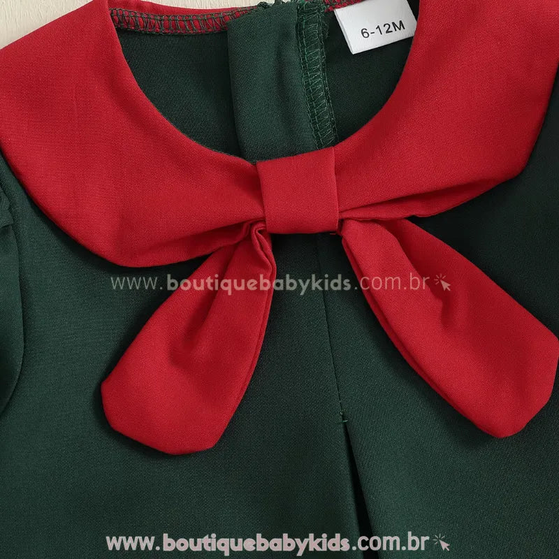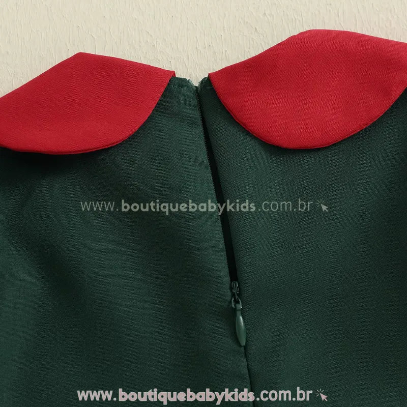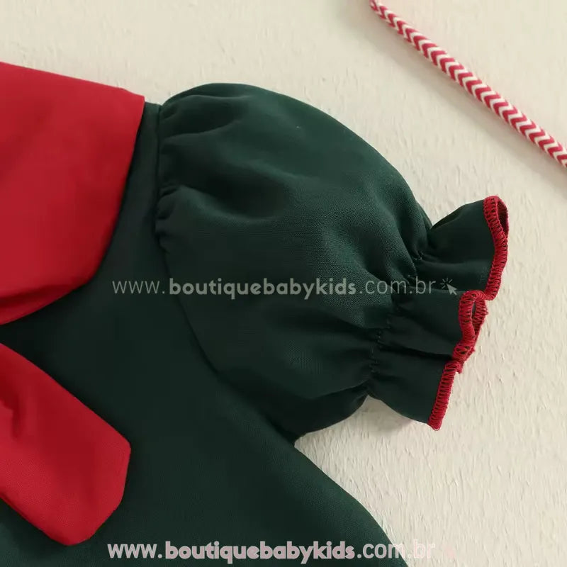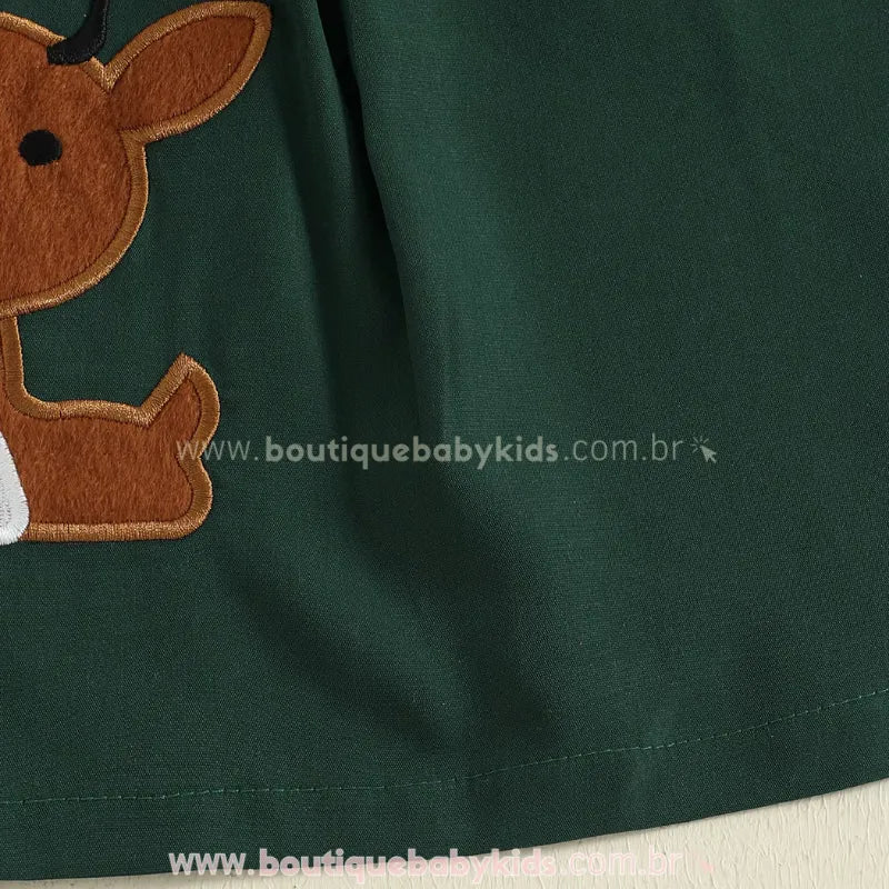 Design Natalino Encantador: O destaque fica por conta da linda aplicação bordada de rena com laço vermelho, que traz um toque lúdico e festivo à peça. O colarinho vermelho contrastante e as manguinhas bufantes com babadinhos completam o visual com muita ternura e sofisticação.