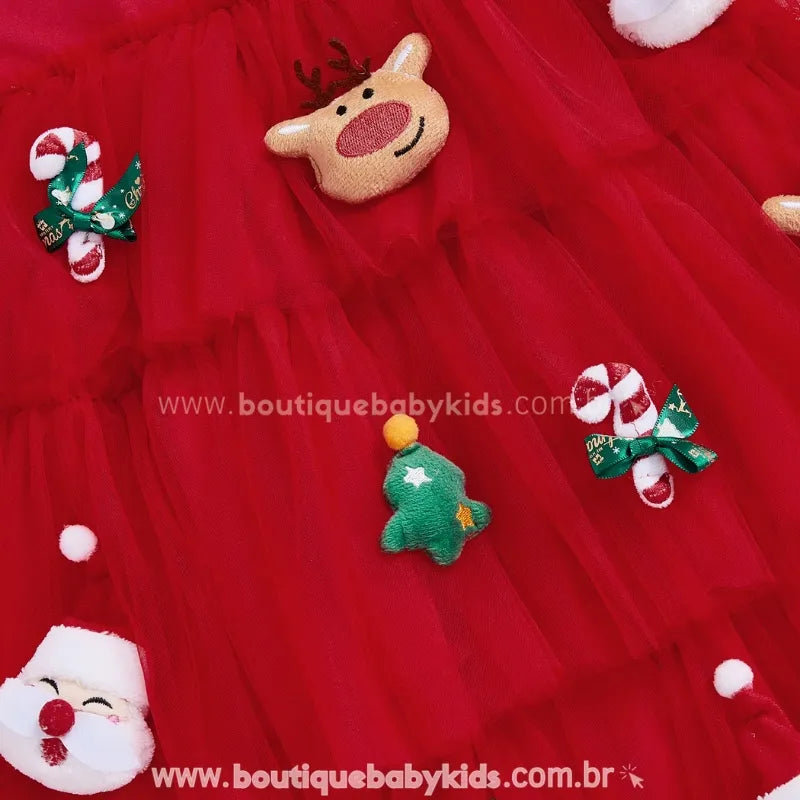 Apliques Natalinos 3D: A saia em camadas são adornadas com mini apliques fofos de Papai Noel, renas, árvores e docinhos, detalhes que tornam o look ainda mais especial e cheio de personalidade.