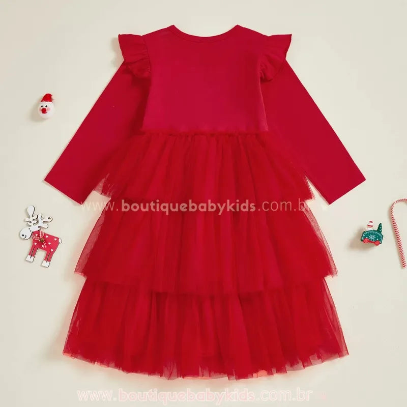 🎅 O Vestido Infantil Tule 'Santa Baby' com Apliques é uma verdadeira joia natalina, perfeita para deixar sua pequena deslumbrante nas celebrações de fim de ano! Tecido leve e aplicações temáticas, ele combina conforto, elegância e o charme mágico do Natal.