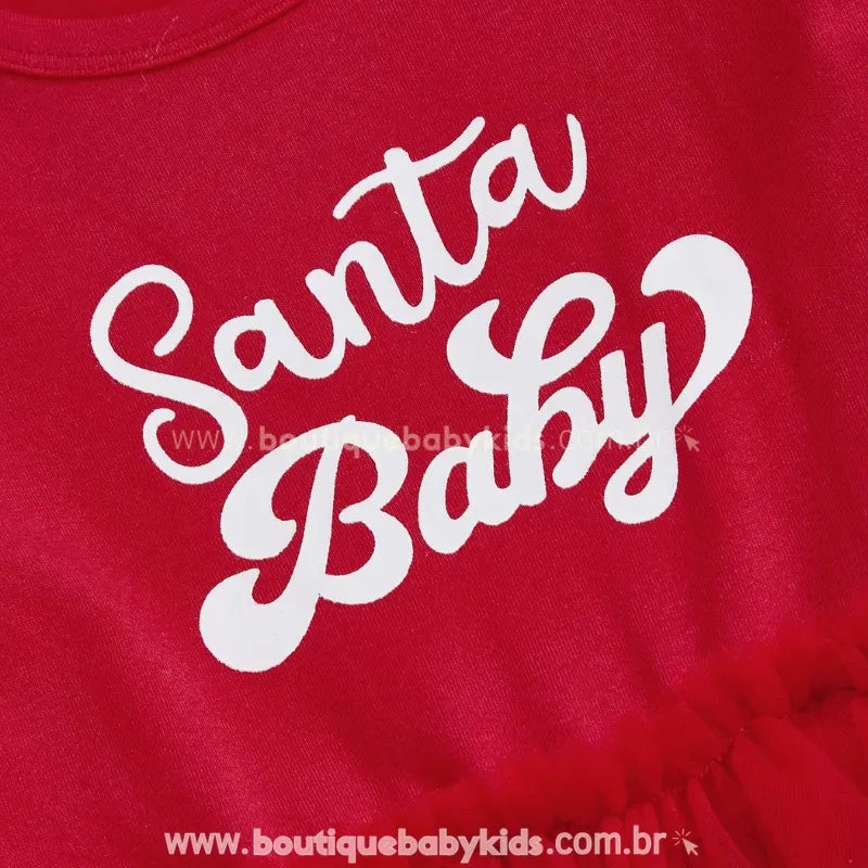 Design Encantador: O modelo traz o clássico vermelho natalino, com a frase “Santa Baby” na parte superior e camadas de tule volumosas que criam um visual delicado e festivo.