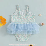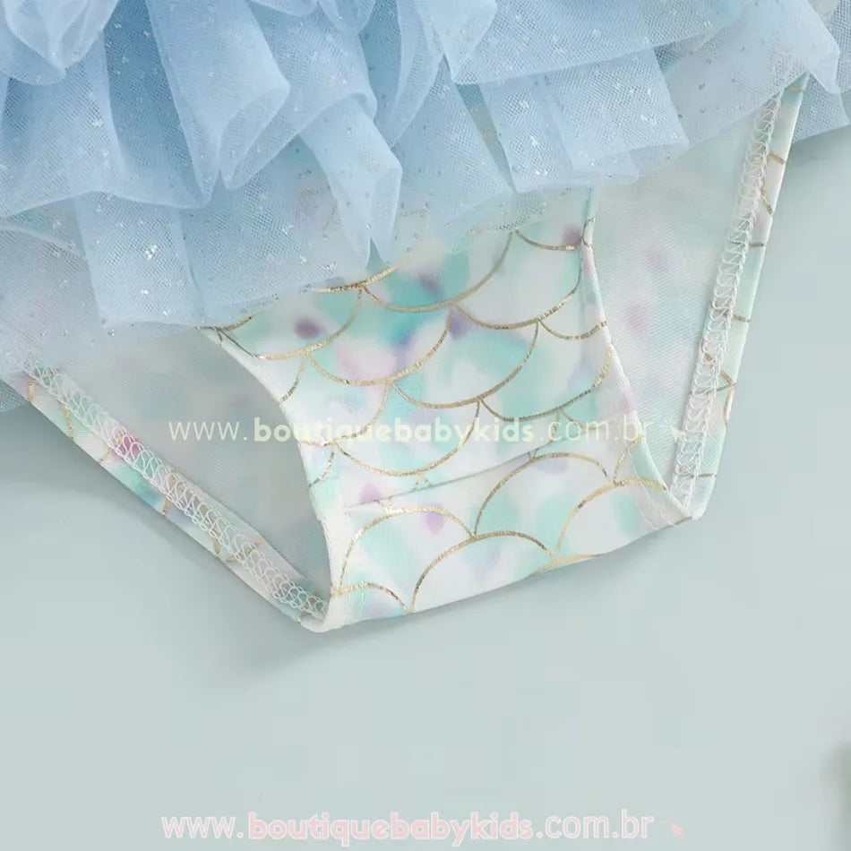 Saia Adorável: A saia em camadas de tule azul cintilante adiciona charme e um toque lúdico ao modelo.