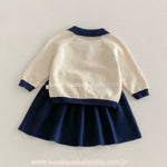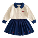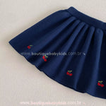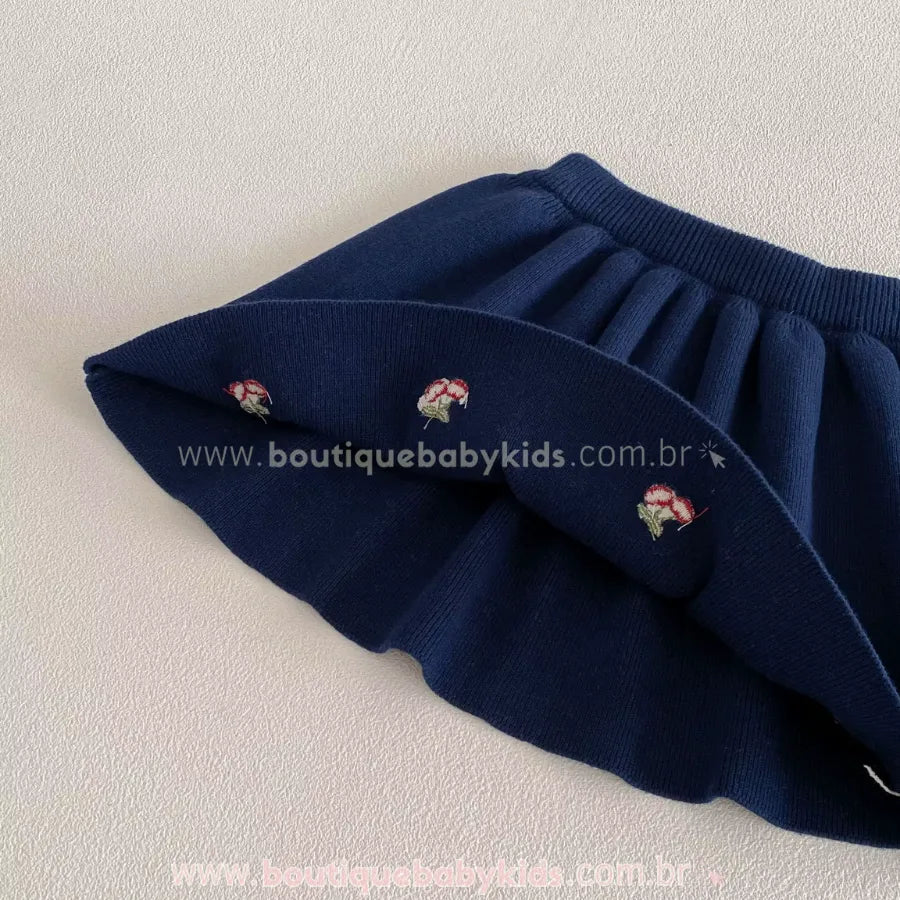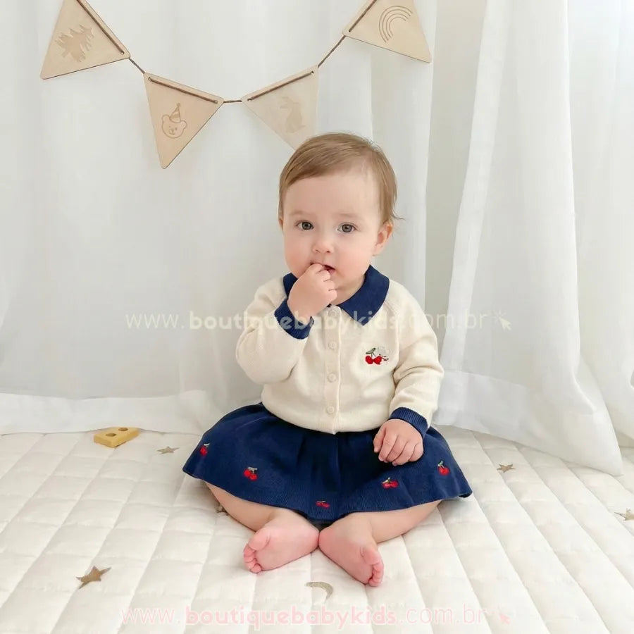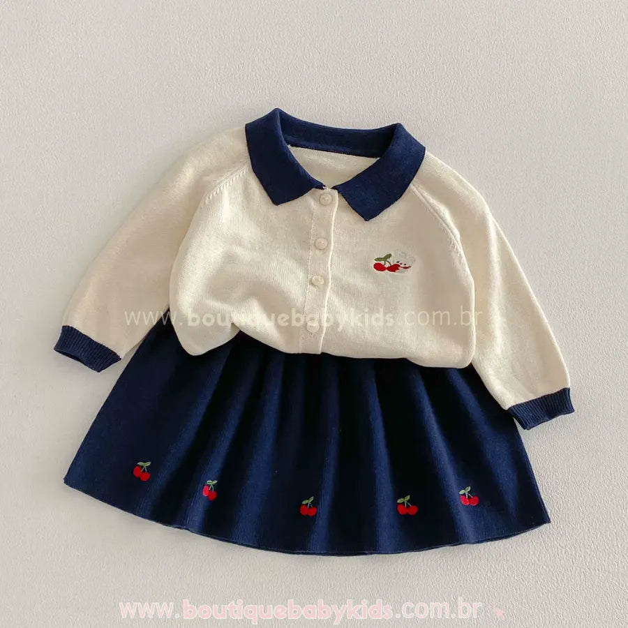 Saia Combinando: A saia em tricot azul marinho complementa o look, apresentando pequenos bordados de cerejinhas distribuídos de forma delicada.