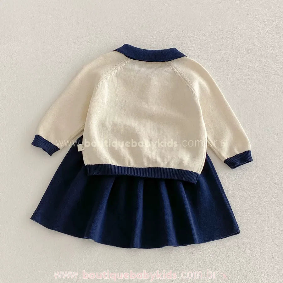 Design Delicado e Exclusivo: O conjunto apresenta um visual elegante com inspiração clássica. A parte superior em tom creme possui gola contrastante em azul marinho e delicado bordado de cereja no peito.