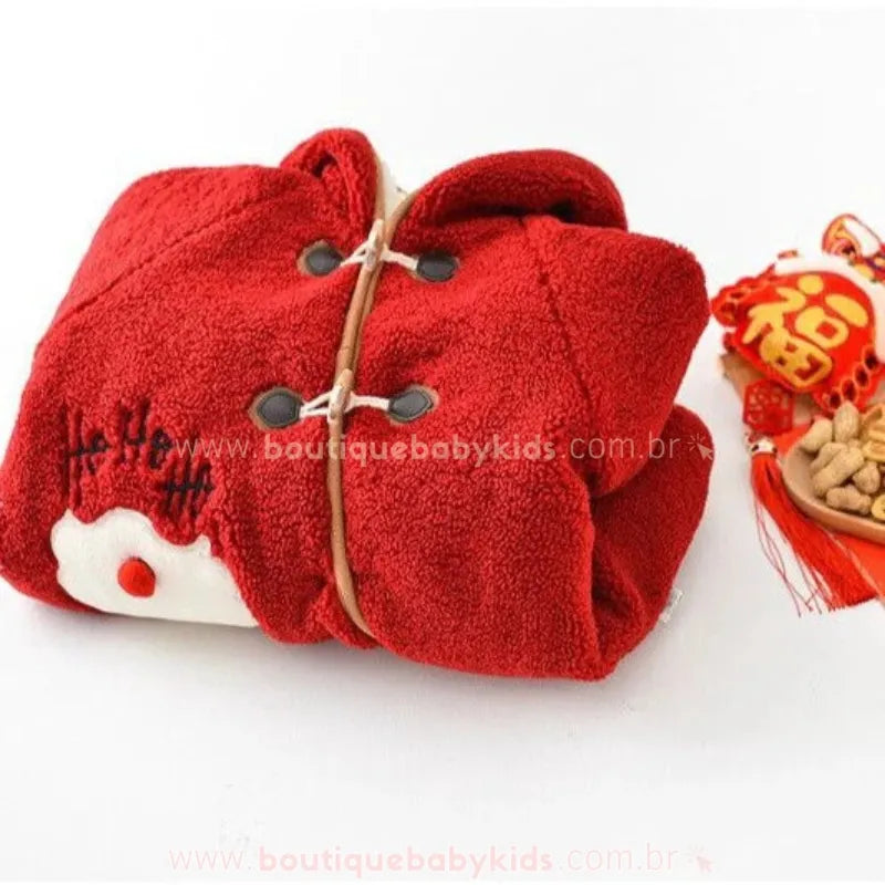 Material Confortável: Confeccionado em tecido felpudo super macio, quentinho e agradável ao toque, mantém o bebê aquecido e confortável. O forro interno aveludado garante ainda mais bem-estar e proteção contra o frio.