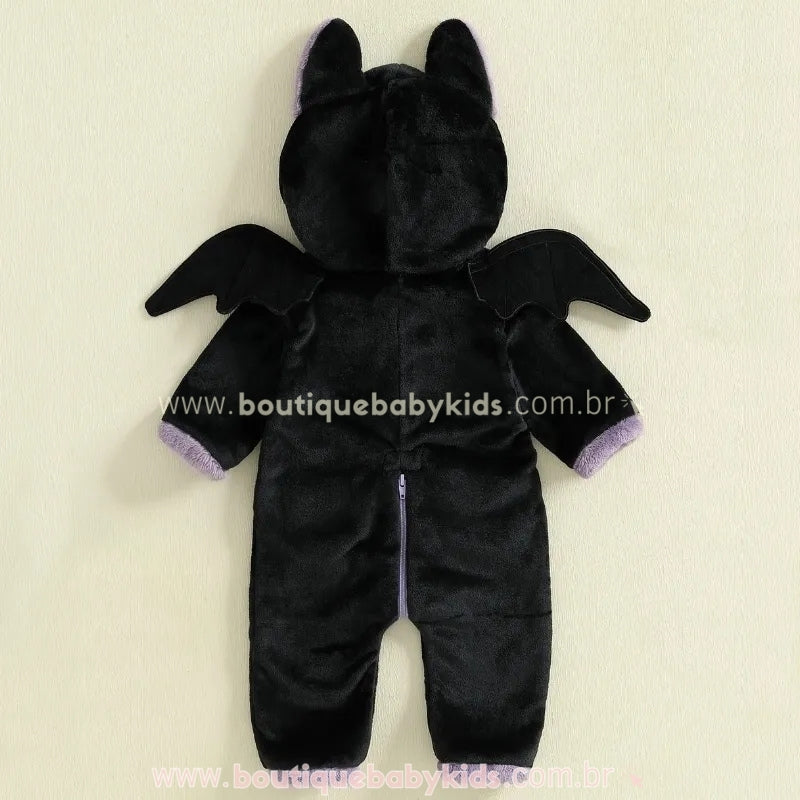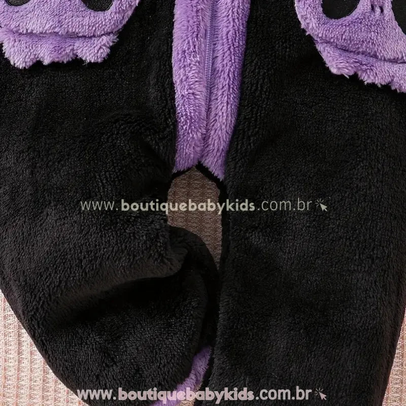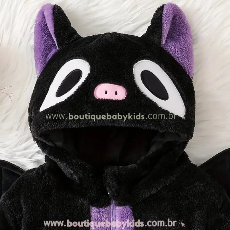 Design Exclusivo de Morcego: Capuz com orelhinhas roxas, olhos bordados e narizinho rosa, além de asas aplicadas nas costas para completar o visual.