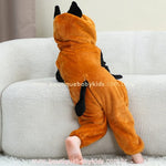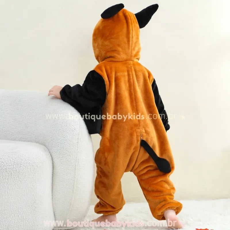Design Temático de Morceguinho: Transforma o bebê em um morceguinho encantador com capuz decorado com orelhinhas pretas e rosto bordado, além de mangas com extensões em tecido preto que formam as asas. Um visual lúdico, divertido e cheio de personalidade, perfeito para fantasias, festas ou sessões de fotos inesquecíveis.