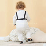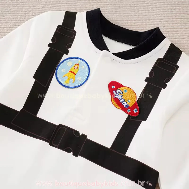 Design de Astronauta: Estampa com patches de foguete e planeta, além de tiras que simulam suspensórios espaciais, trazendo realismo e charme ao look.