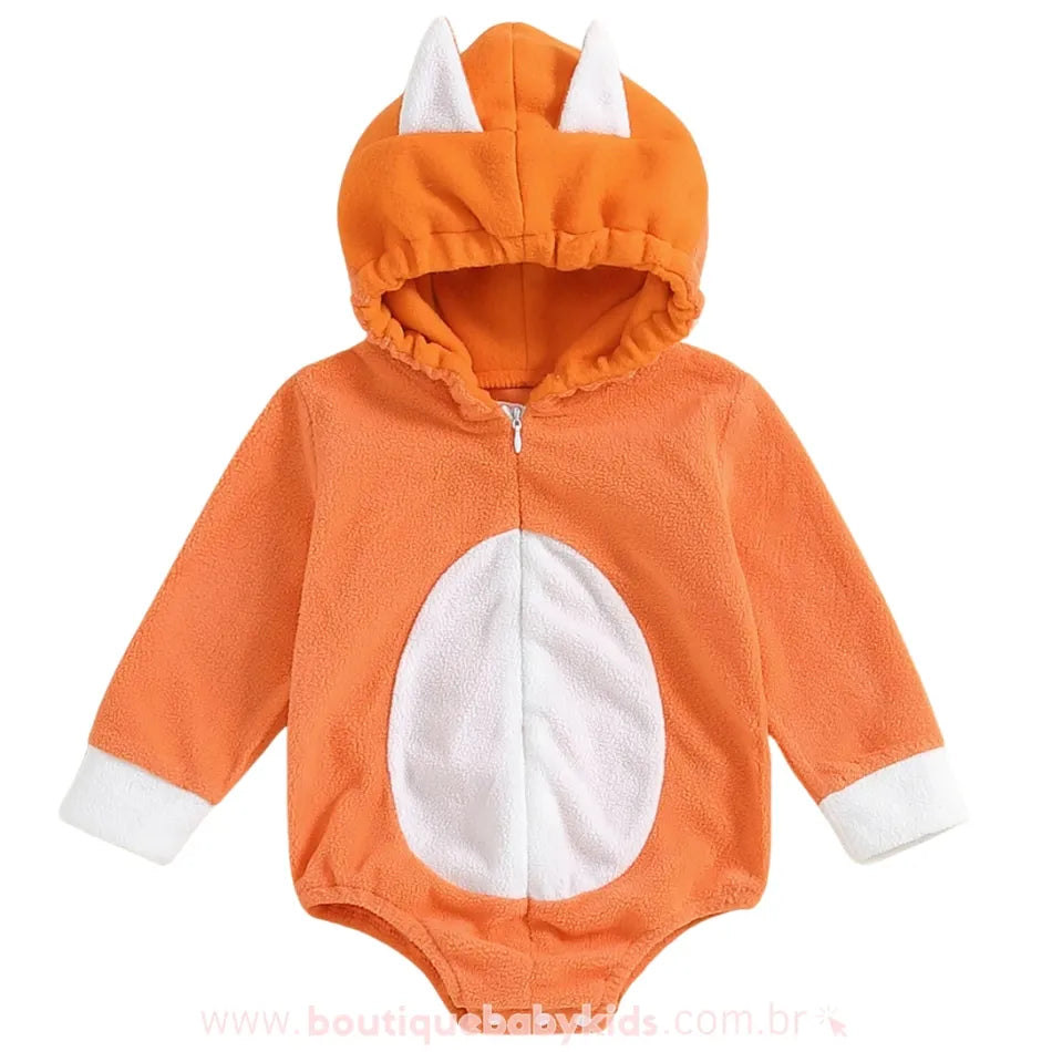 Inspiração Bluey e Bingo: Com duas versões — azul para representar o Bluey e laranja para homenagear a Bingo — o body traz capuz com orelhinhas aplicadas, rabinho e manchinhas nas costas, fazendo alusão direta aos personagens de forma encantadora.