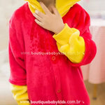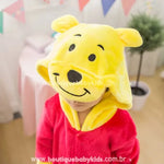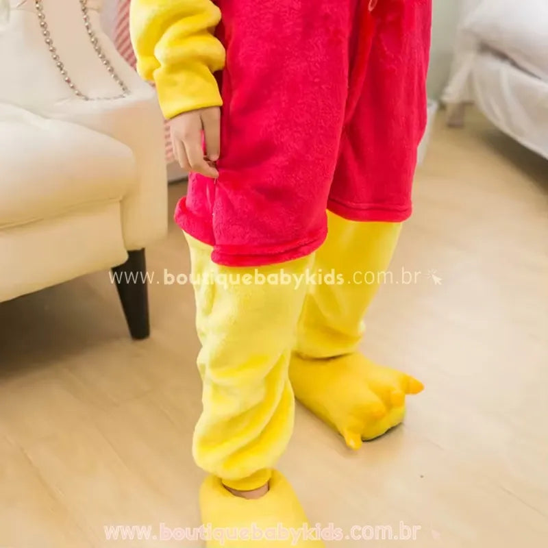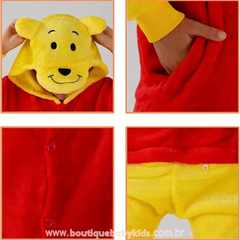 Design Inspirado no Ursinho Pooh: Inspirado fielmente no visual clássico do adorável Ursinho Pooh, este macacão infantil traz uma combinação encantadora das cores vermelho vibrante e amarelo dourado, remetendo ao seu icônico suéter e corpo peludo.