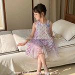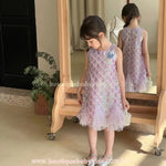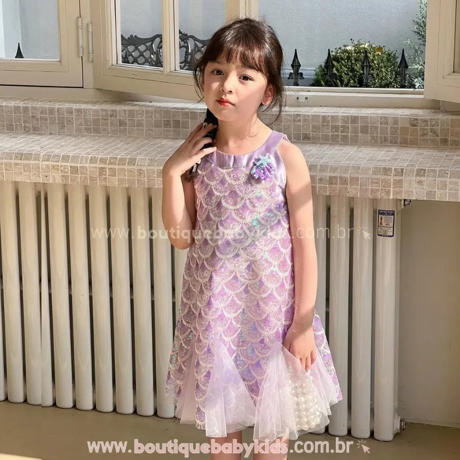 Foto de produto do Vestido Infantil Encanto da Sereia, mostrando o padrão de escamas em paetê lilás e a barra fluida em tule.