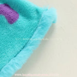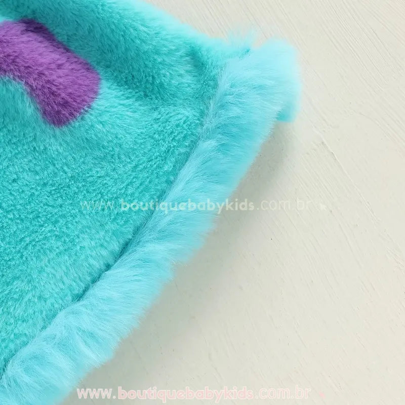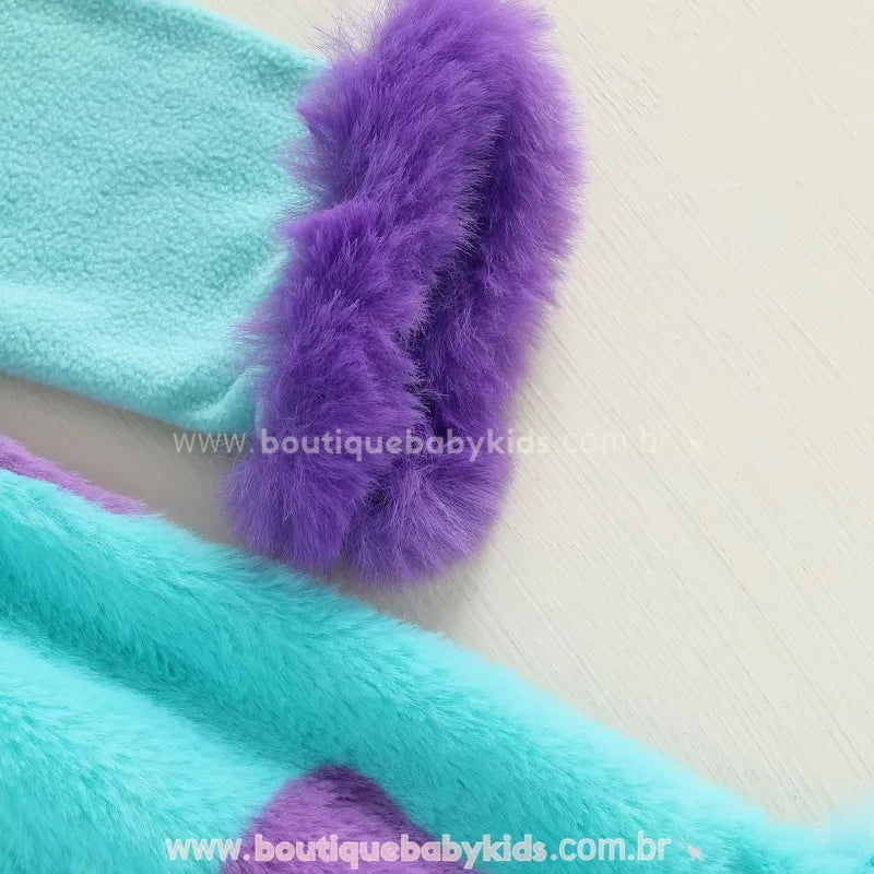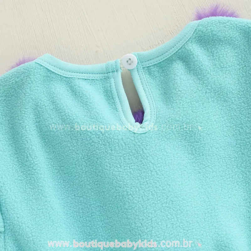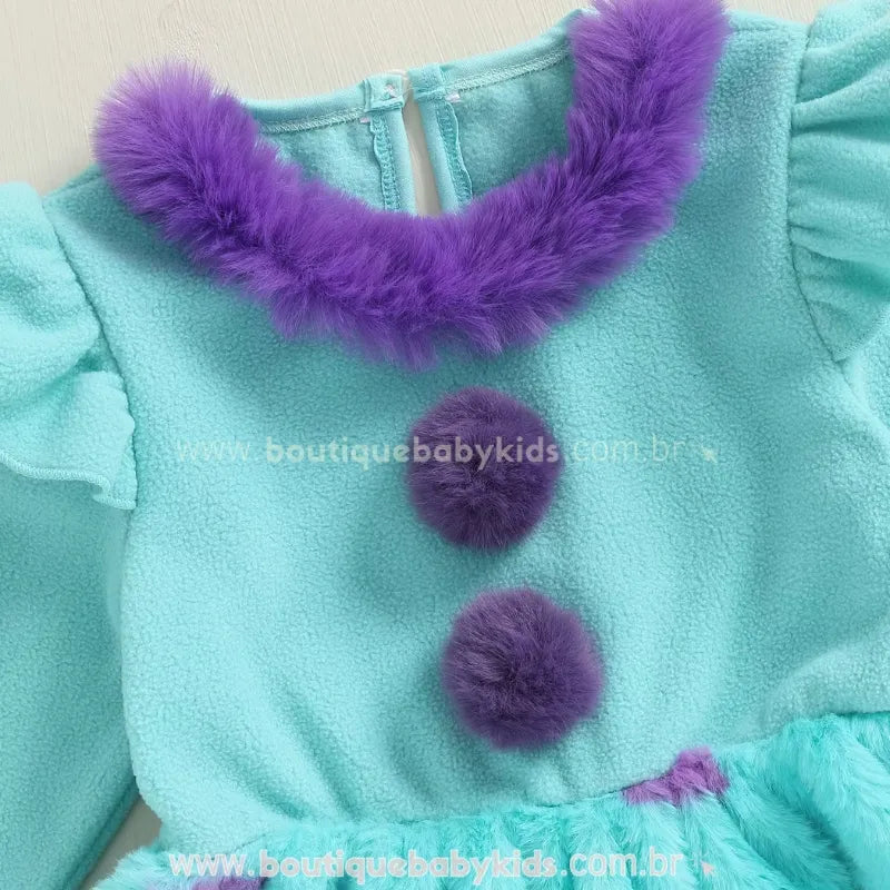 Design Encantador de Monstrinho: Vestido azul com detalhes roxos, incluindo bolinhas aplicadas, gola felpuda, punhos decorados e botões peludinhos que remetem ao visual marcante do Sullivan.