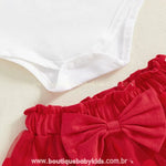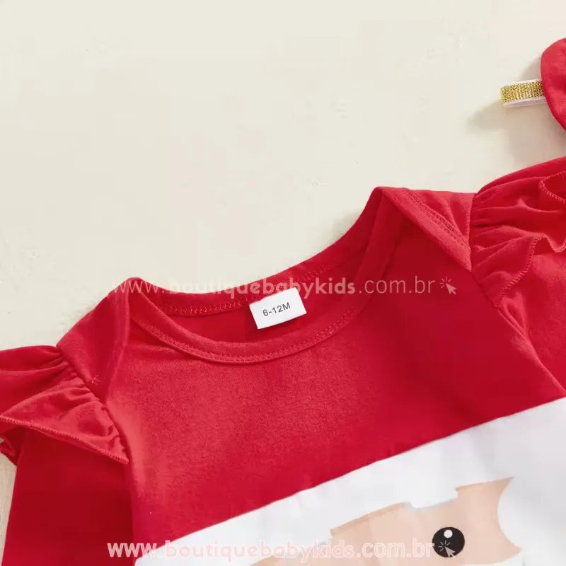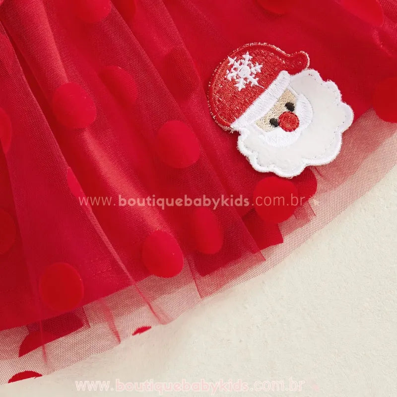 Design Mágico e Festivo: O body vermelho traz o rosto do Papai Noel, criando um visual lúdico e divertido. A saia de tule vermelho é decorada com bordados do bom velhinho e um laço central volumoso que completa o look com um toque encantador.