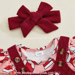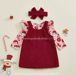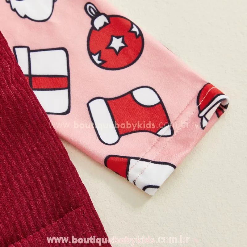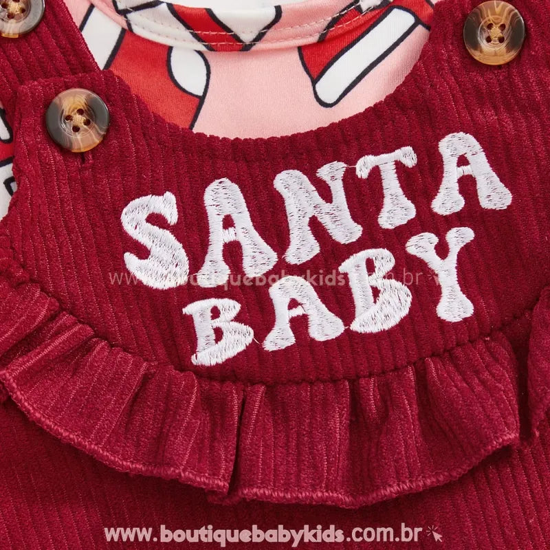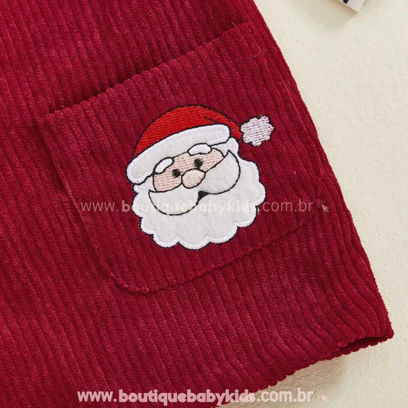 Jardineira Charmosa: Saia-jardineira em veludo cotelê vermelho, com detalhes de Papai Noel nos bolsos frontais e a frase “Santa Baby” em destaque, deixando o look ainda mais especial.