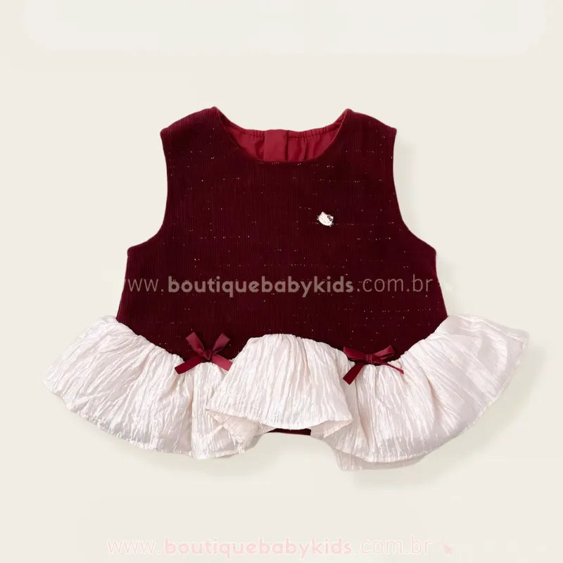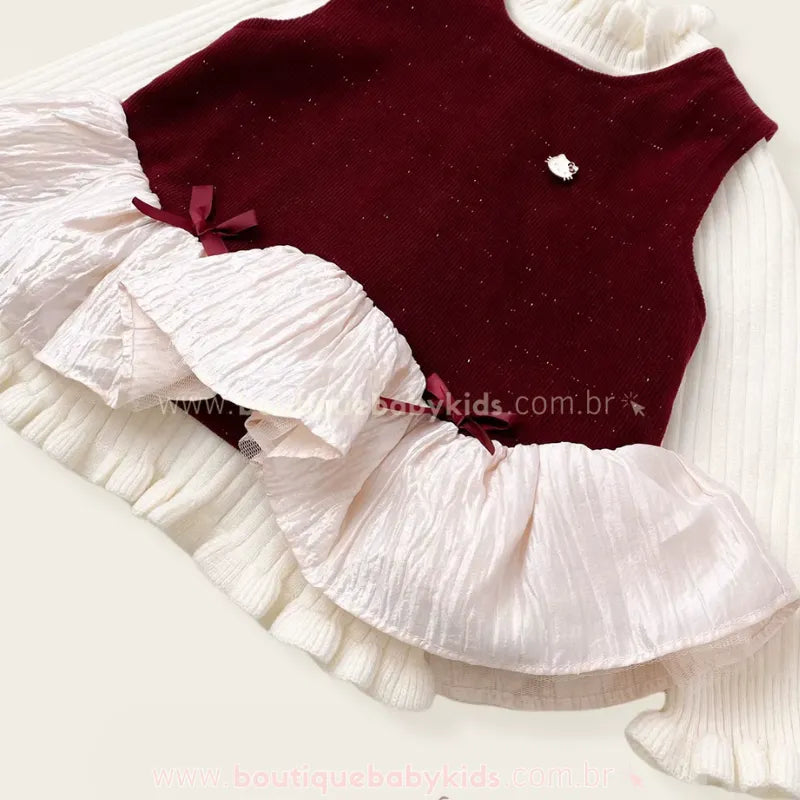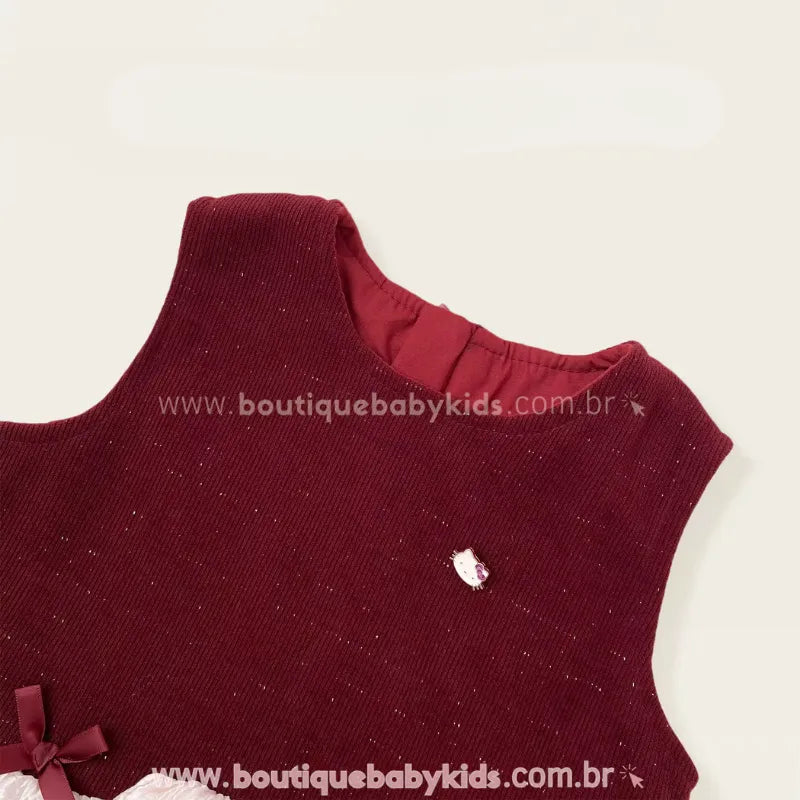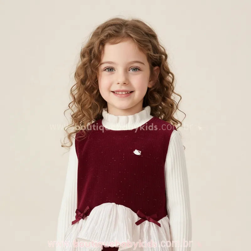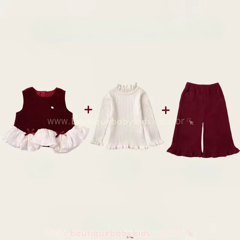 por🍒O Conjunto Infantil Hello Kitty Cherry é uma proposta sofisticada e atemporal: um trio elegante que combina um colete em tom vinho, blusa canelada de mangas longas e calça com barra rodada, sendo ideal para ocasiões especiais ou para um look diferenciado e de acabamento refinado.