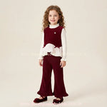 Conjunto Completo: Três peças harmonizadas entre si: colete vinho com broche da Hello Kitty, blusa canelada de gola delicada e calça com barra rodada. Um conjunto completo que já entrega o look inteiro pronto.
