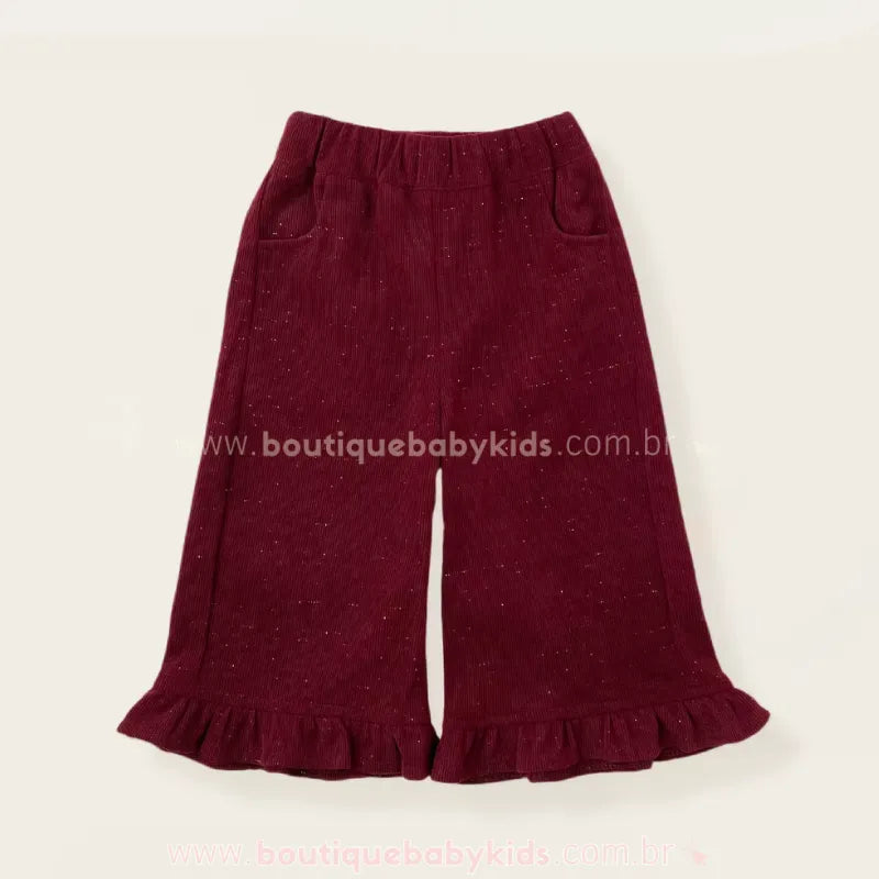 Design Delicado e Exclusivo: O colete em tom vinho traz brilho discreto e acabamento texturizado; o detalhe do broche pequeno da Hello Kitty acrescenta personalidade sem exageros. A blusa canelada com gola levemente franzida equilibra delicadeza e sobriedade, enquanto a calça com barra rodada completa a composição com charme.