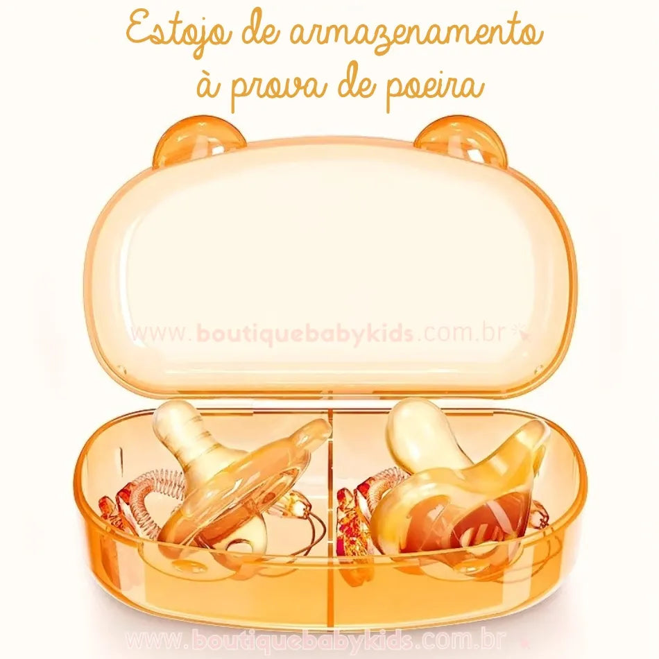 Estojo Protetor Antipoeira: O estojo é compacto, com tampa de fácil abertura e fechamento, ideal para guardar as chupetas de forma prática e higiênica.