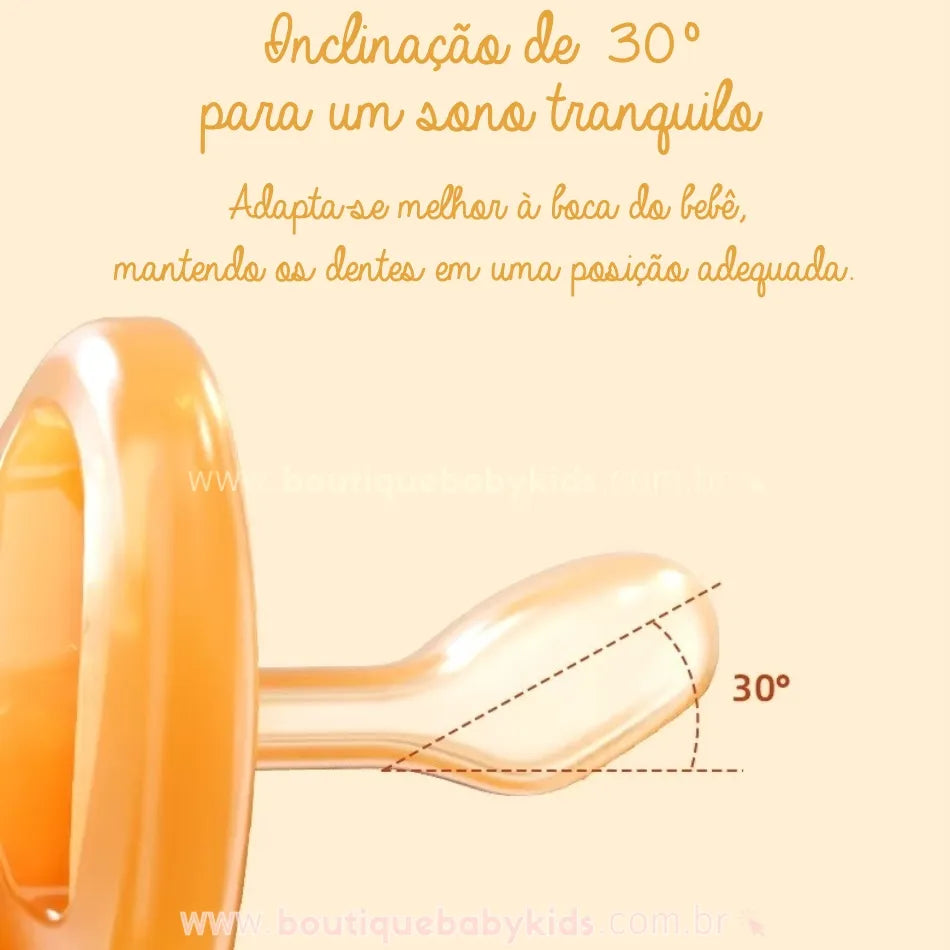 Chupeta Noturna: Projetada com bico plano em ângulo de 30°, especialmente desenvolvido para o uso noturno, ajudando a posicionar a boca e os dentes do bebê adequadamente durante o sono.