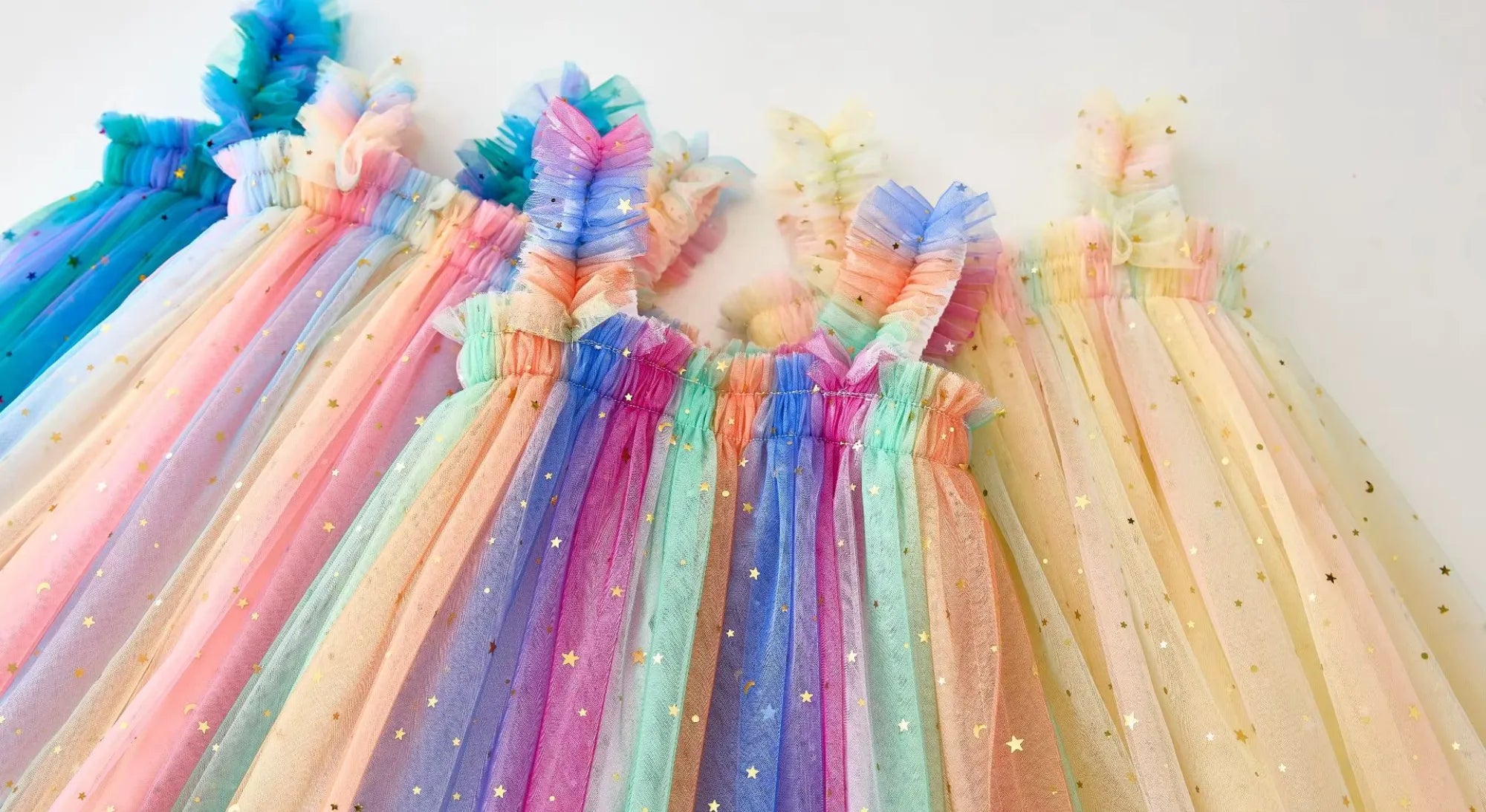 Deixe a imaginação brilhar com nossos vestidos de tule multicoloridos.