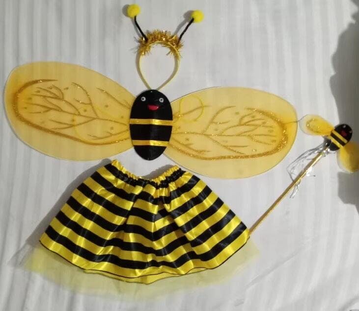 Fantasia Completa: Inclui saia de abelhinha listrada, asinhas com glitter, tiara com anteninhas e varinha mágica.