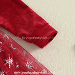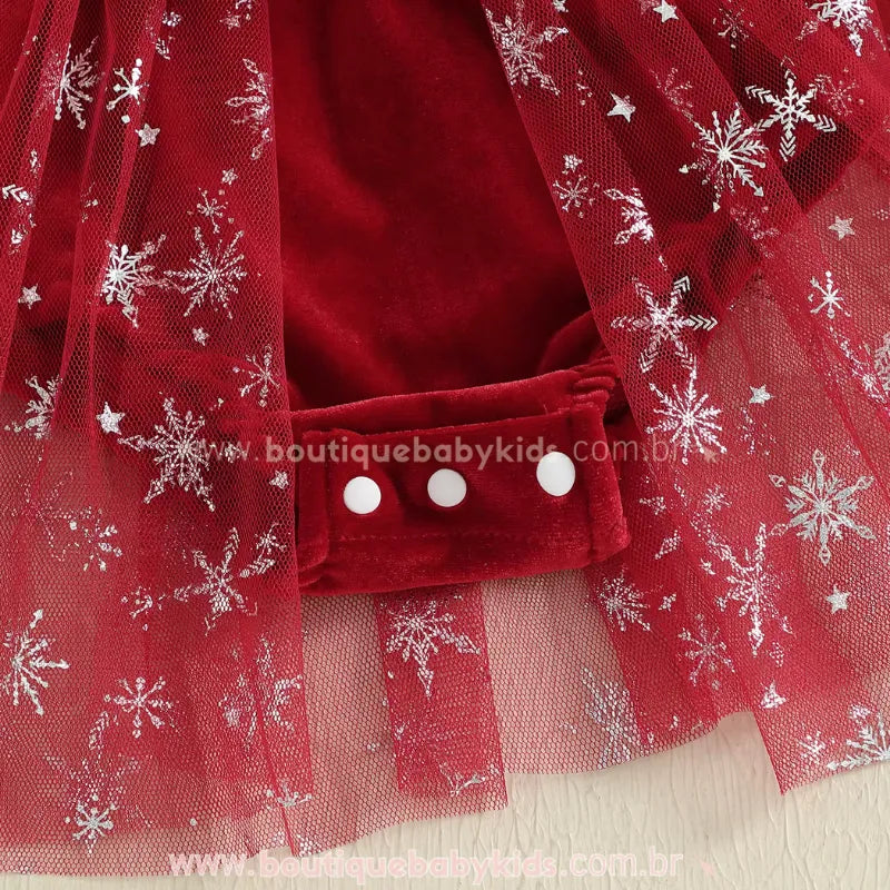 Design Encantador: Com a frase 'Santa Baby' bordada em branco e detalhes de floquinhos de neve, o visual é puro encanto! A saia de tule com brilho e laço frontal adicionam um toque mágico e festivo, tornando o look digno de um conto de Natal.
