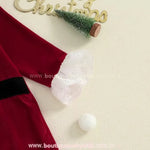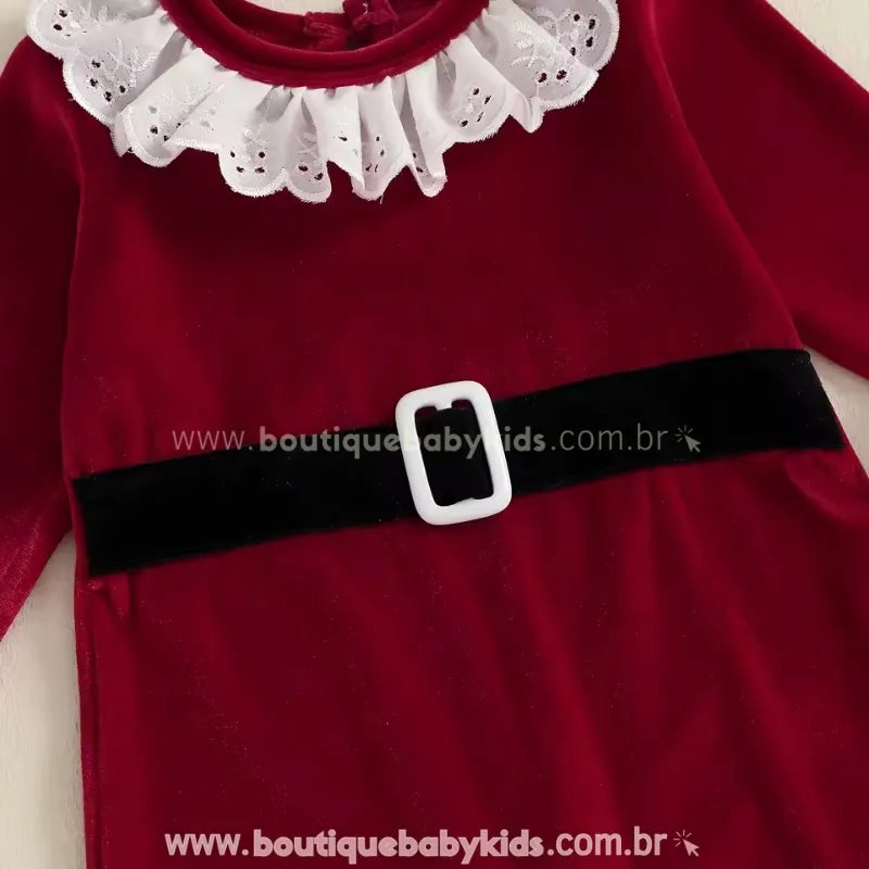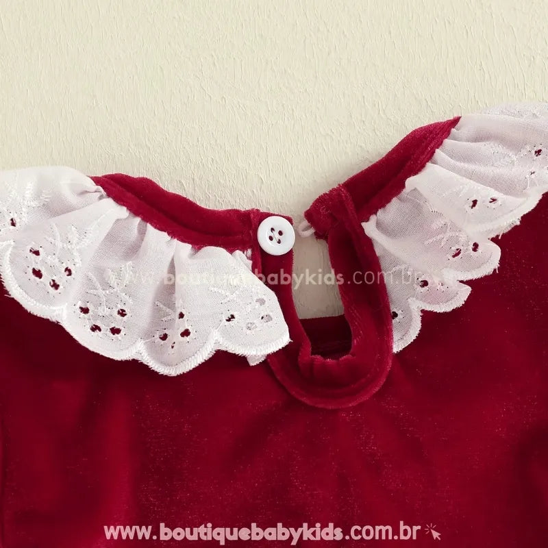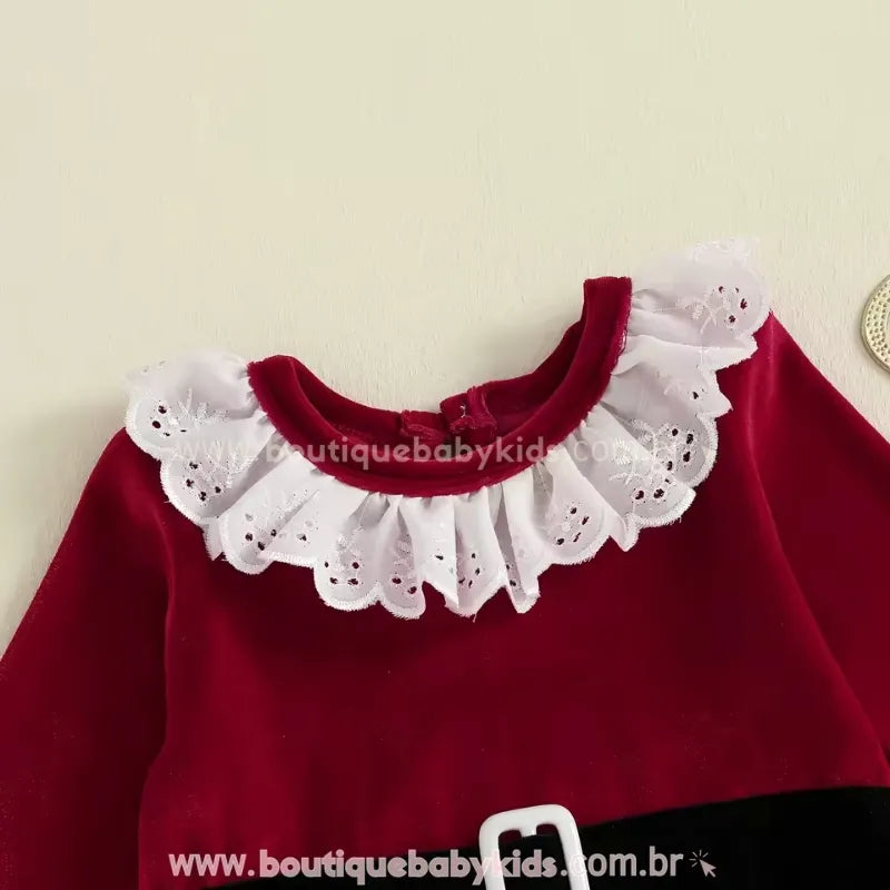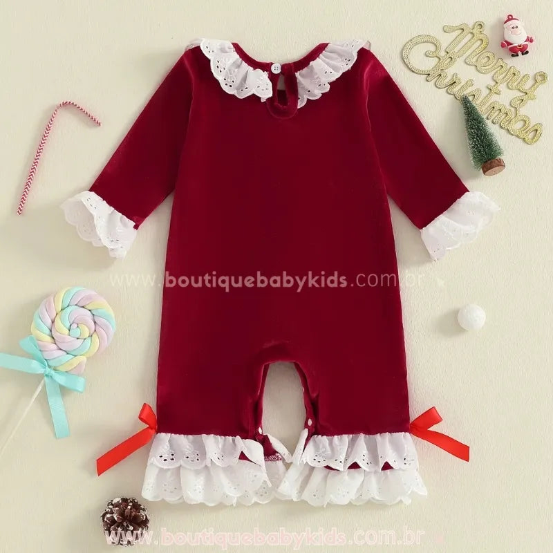 Design Temático de Natal: Com gola e punhos em renda branca delicada, o macacão traz o clássico vermelho natalino com faixa em veludo preto e fivela decorativa, criando um visual digno das festas mais especiais. Os laços vermelhos nas barras completam o look com um toque de fofura e elegância.