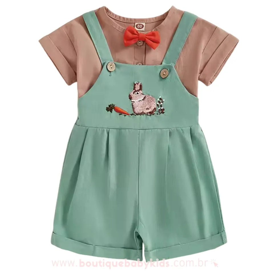 Jardineira Temática: Em verde pastel, a jardineira conta com um bordado detalhado de coelhinho e cenoura na parte frontal, além de um pompom traseiro que simula o rabinho de coelho, criando um visual adorável.