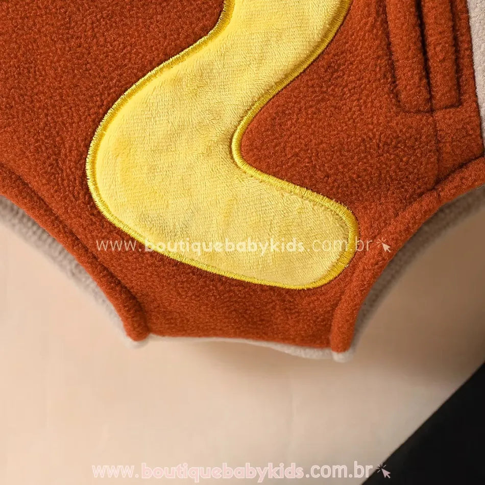 Design Temático: Com detalhes que simulam o visual de um hot dog, incluindo "mostarda" aplicada em feltro na parte frontal, capuz aconchegante e cores vibrantes que trazem diversão ao visual.