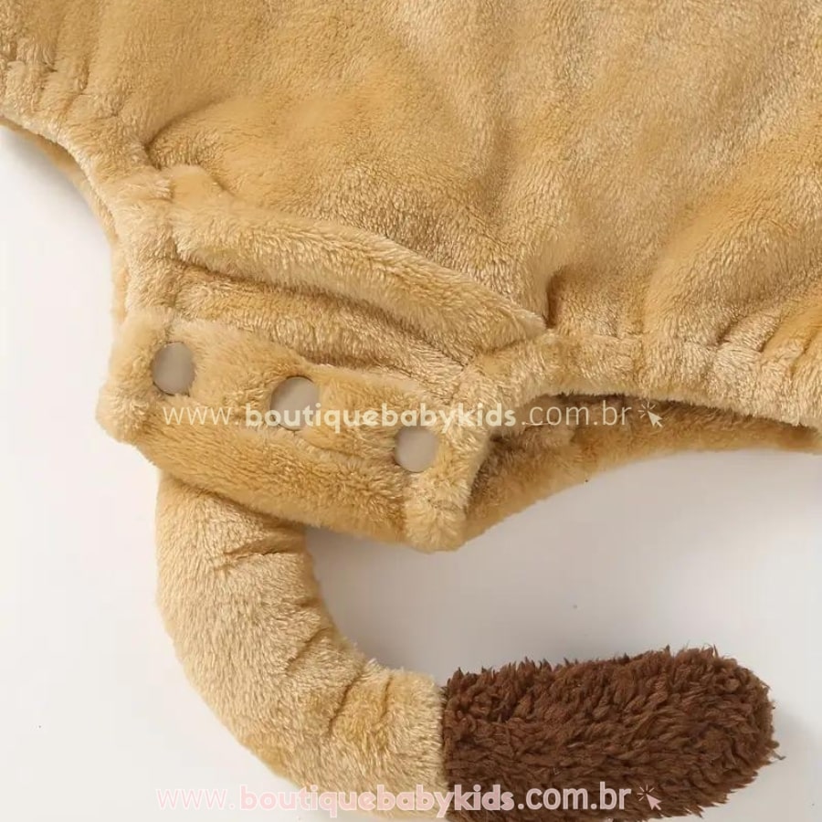 Design do Corpo: A parte central do body, na região da barriga, tem um detalhe em branco que imita o abdômen do leão. A parte traseira do body apresenta uma cauda de leão com enchimento leve. Ela é costurada de maneira firme e segura, o que evita o risco de desprendimento. O detalhe é macio e não incomoda o bebê ao sentar-se.