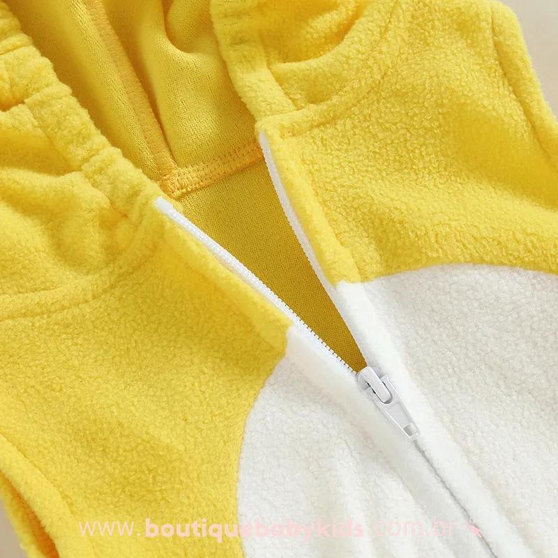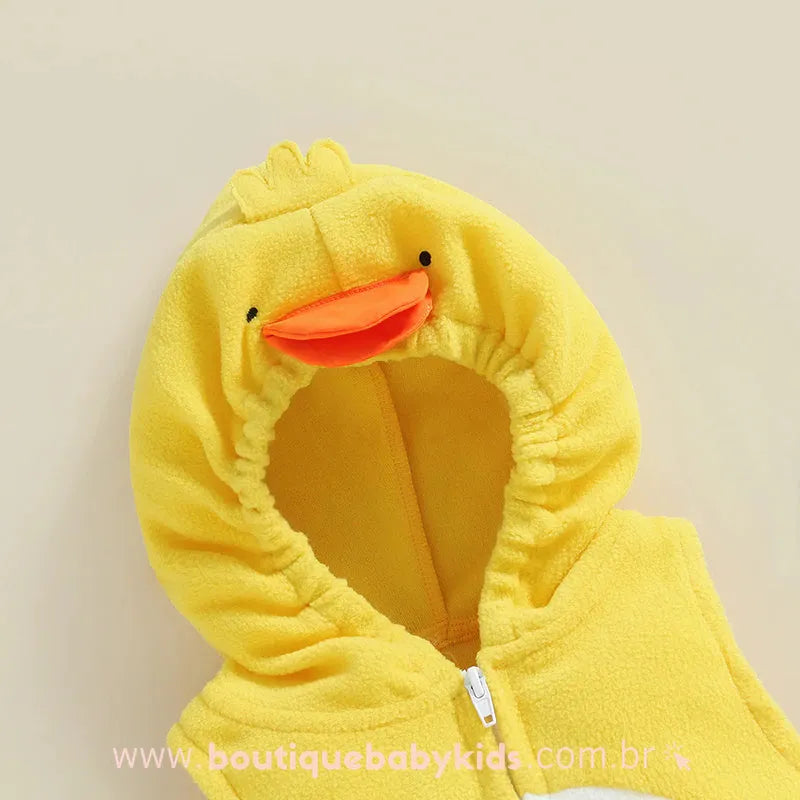 Capuz Fofinho: O capuz é equipado com olhinhos pequenos e um bico de pintinho, trazendo um toque lúdico e divertido.