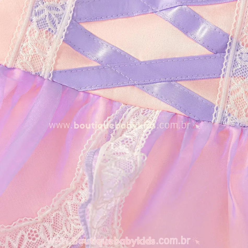 Design de Conto de Fadas: Desenvolvido para remeter ao icônico vestido da Princesa Aurora, com uma combinação harmoniosa de rosa suave e detalhes em lilás, adicionando um toque de encanto e magia.
