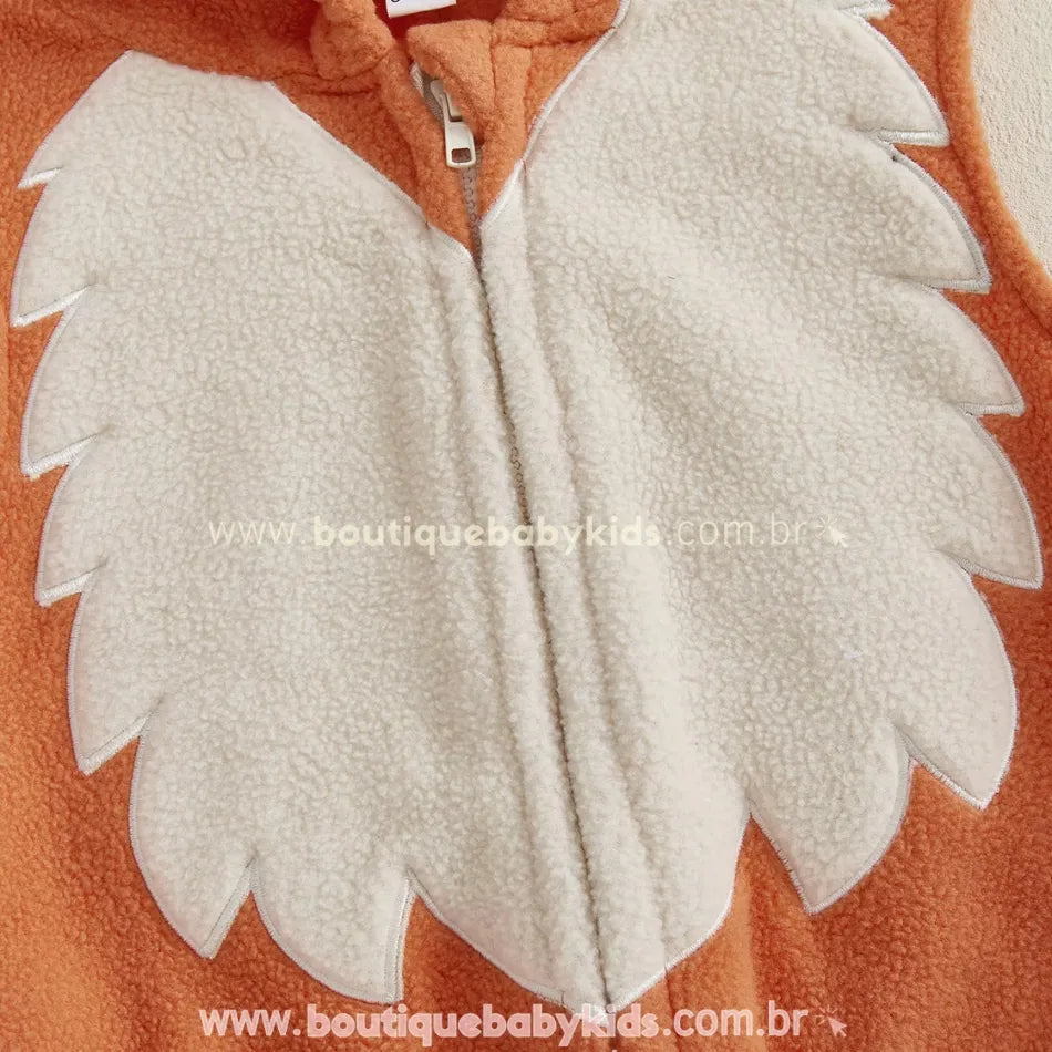 Design Temático: O capuz traz o rostinho bordado e acolchoado da raposinha com orelhinhas aplicadas, enquanto o peitoral tem um aplique branco que simula o pelo do animal, compondo um visual lúdico e encantador.