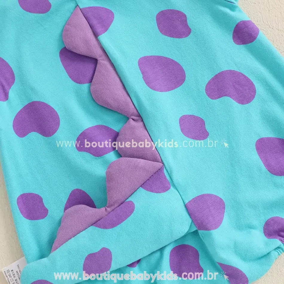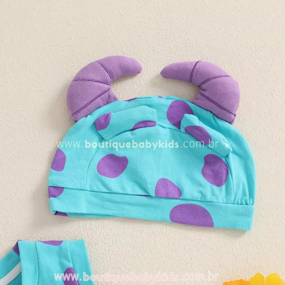 Design Encantador: Body azul com manchas roxas, remetendo ao personagem Sulley, e touca com chifrinhos acolchoados que dão um toque especial e único.