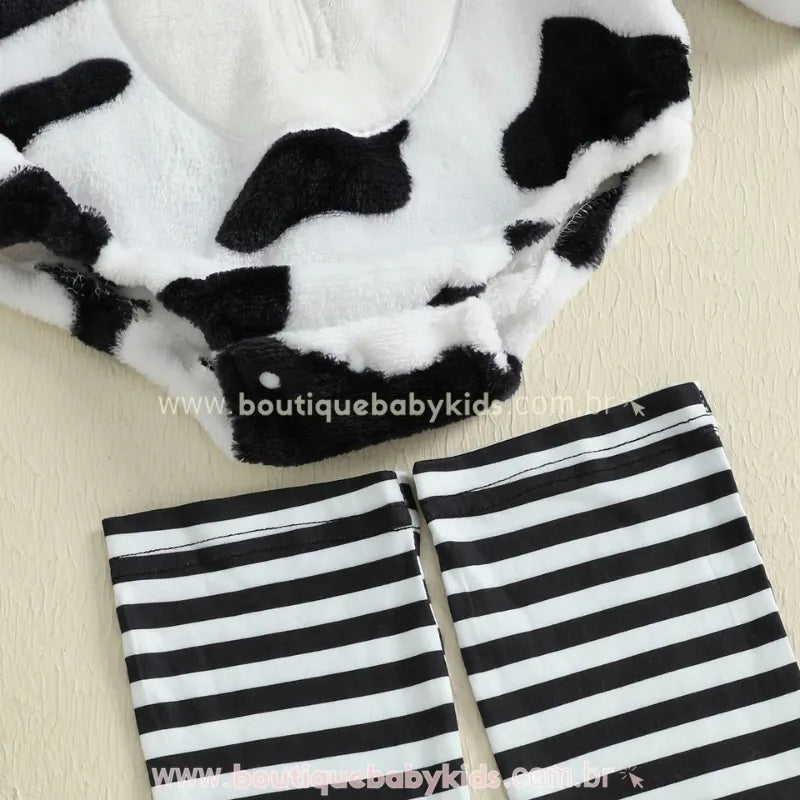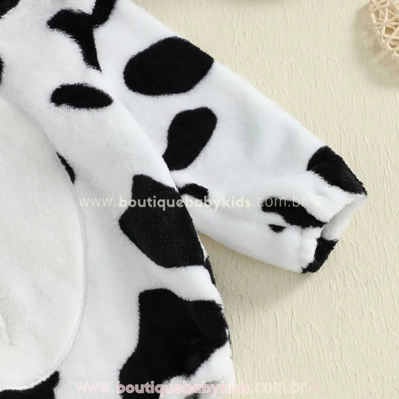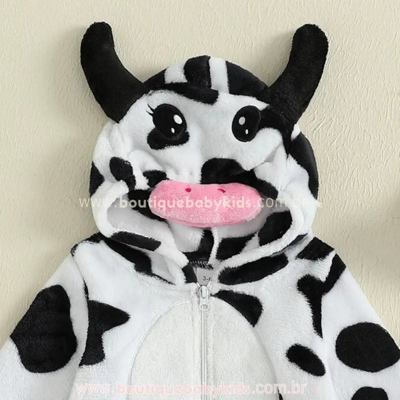 Design Temático de Vaquinha: Estampa de vaquinha preta e branca com barriga branca, capuz com orelhas, chifrinhos e focinho rosa em 3D, criando um visual super divertido.