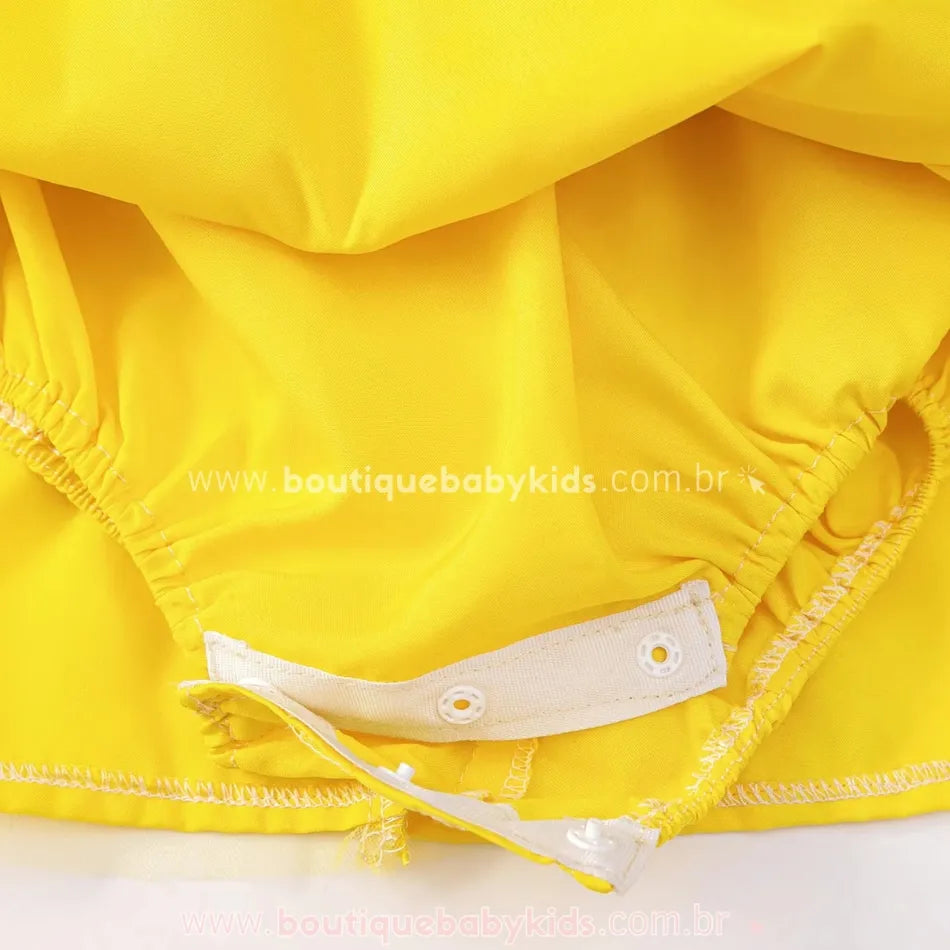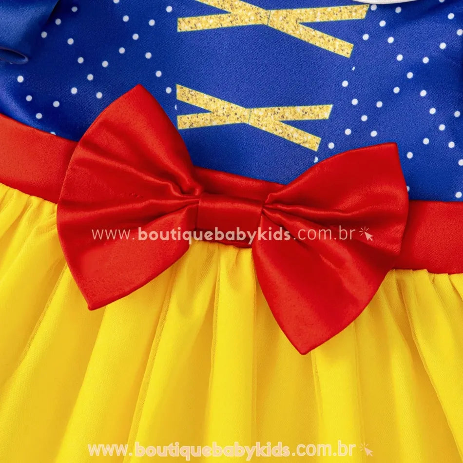 Parte Superior: Em tom azul com detalhes de corselet amarelo, imitando o traje da Branca de Neve. Possui uma gola branca arredondada, que adiciona um toque clássico.