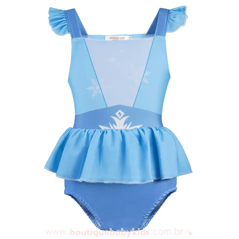 Design Encantador: Inspirado na personagem Elsa, o maiô traz a tonalidade azul clara característica do universo Frozen, com estampas de flocos de neve na parte frontal que remetem ao reino de Arendelle. O detalhe peplum na cintura adiciona um charme especial, imitando delicadamente o efeito de uma saia.